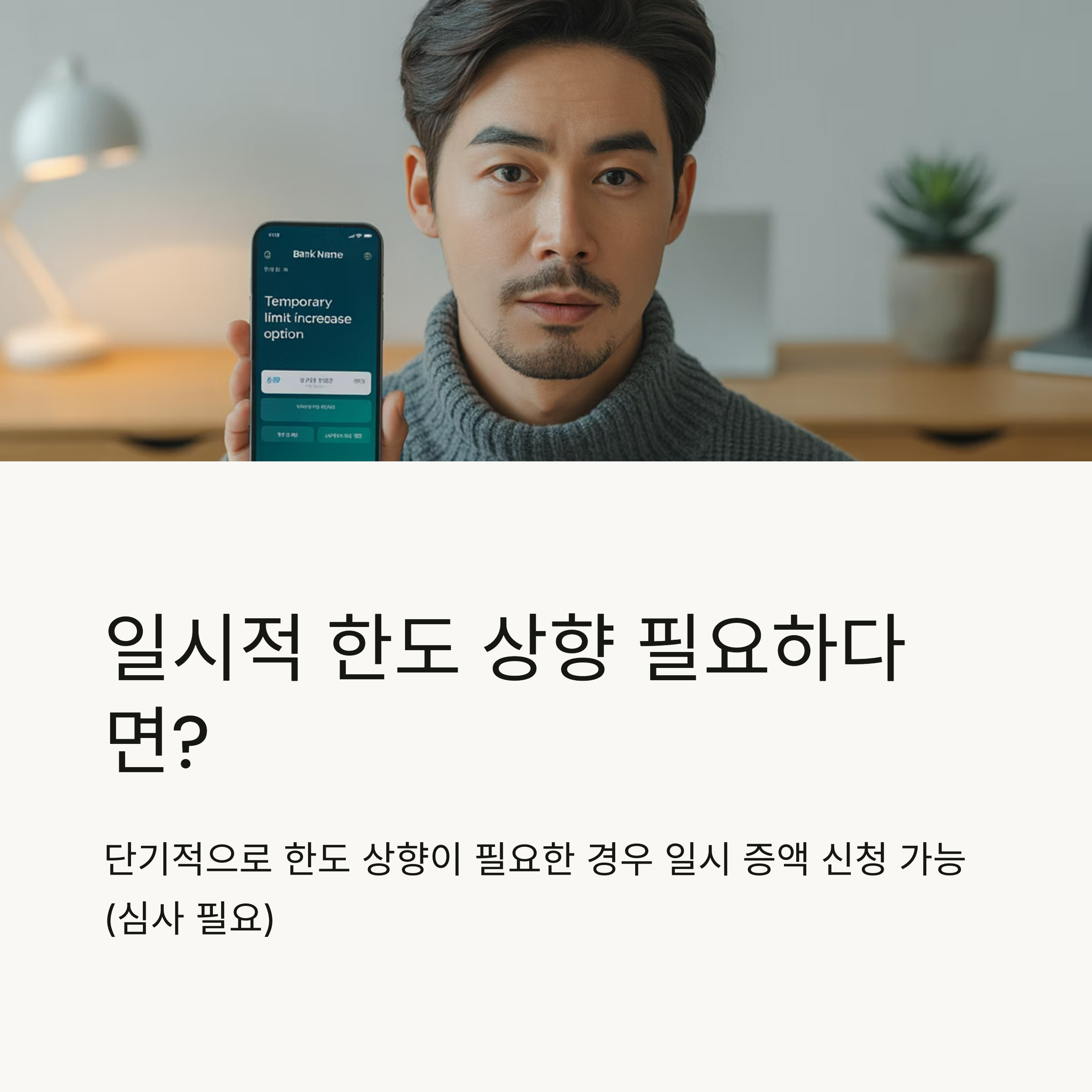 ✅ 단기적으로 한도 상향이 필요한 경우에는 일시 증액 신청도 가능하며, 역시 심사를 거쳐 결정됩니다.