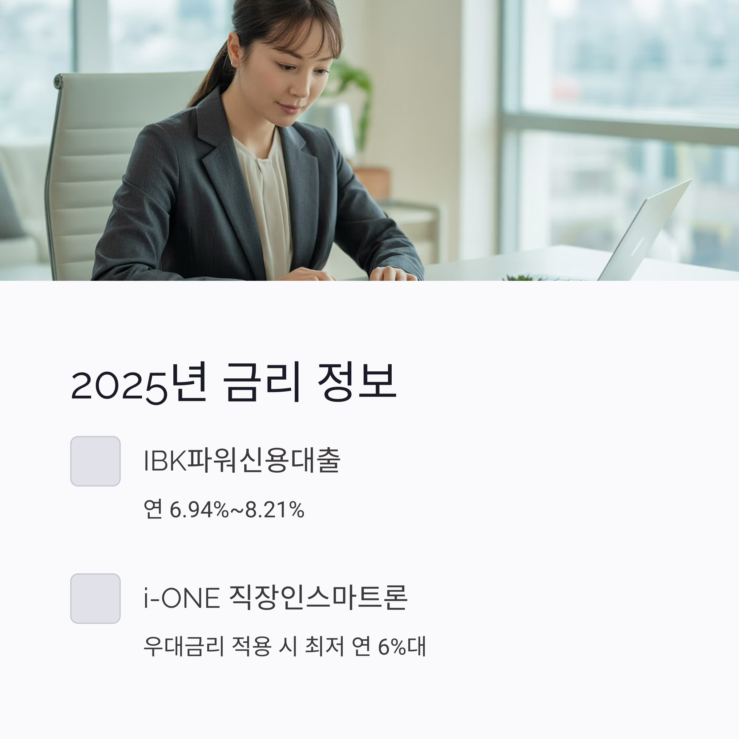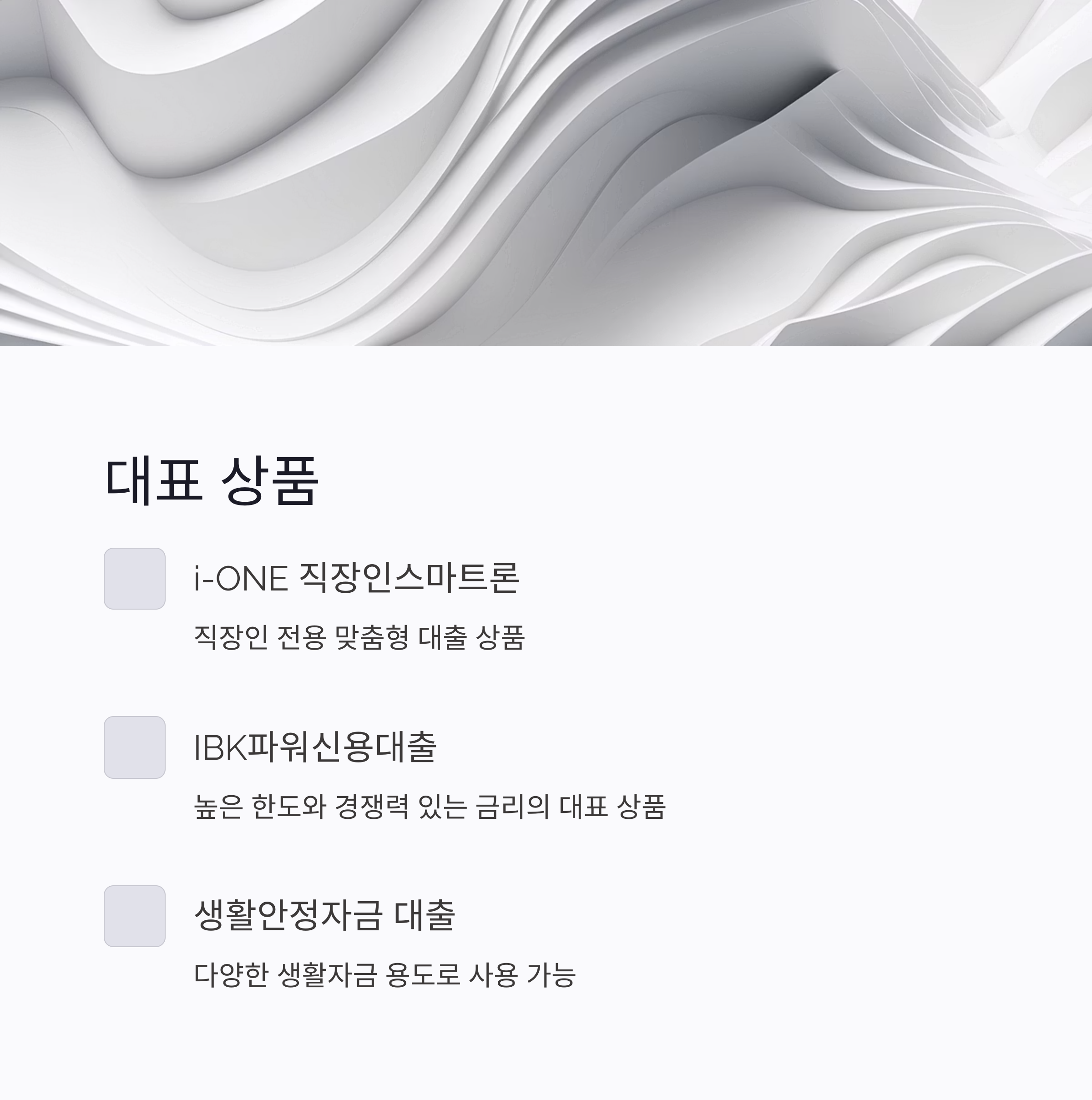 ✔ 대표 상품: i-ONE 직장인스마트론, IBK파워신용대출 등