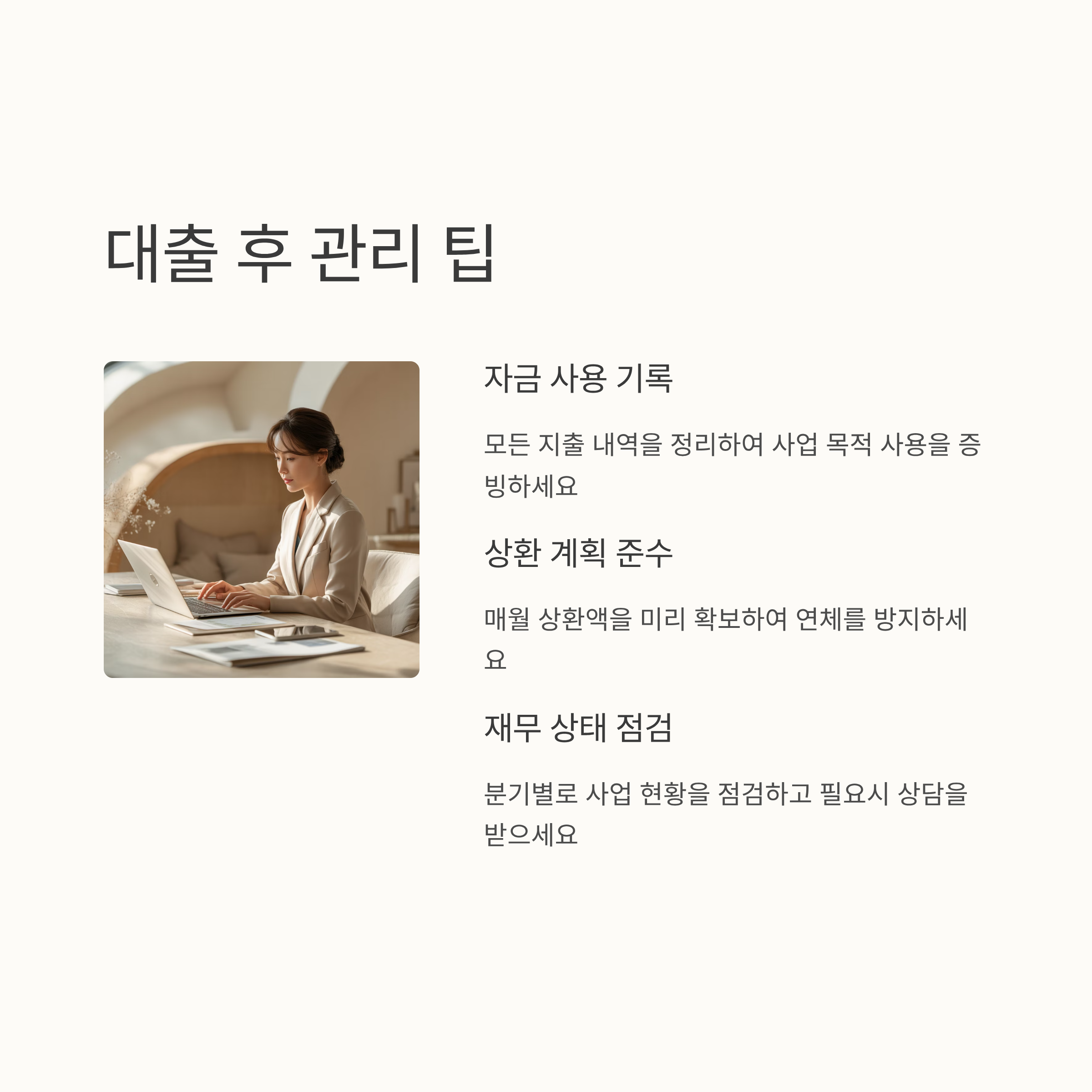 ✔ 자금은 반드시 사업 목적으로만 사용 → 용도 외 사용 시 회수 조치
