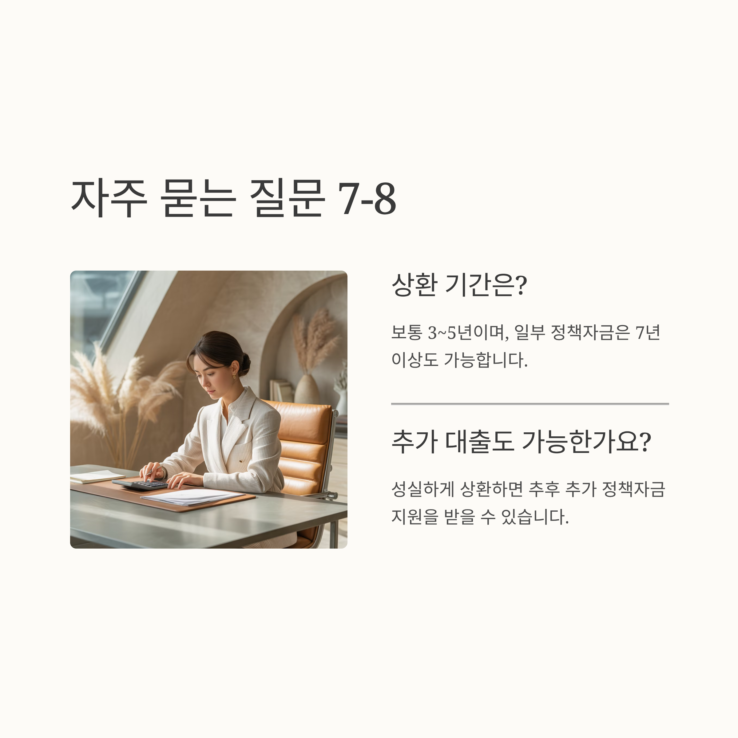 A7. 보통 3~5년이며, 일부 정책자금은 7년 이상도 가능합니다.