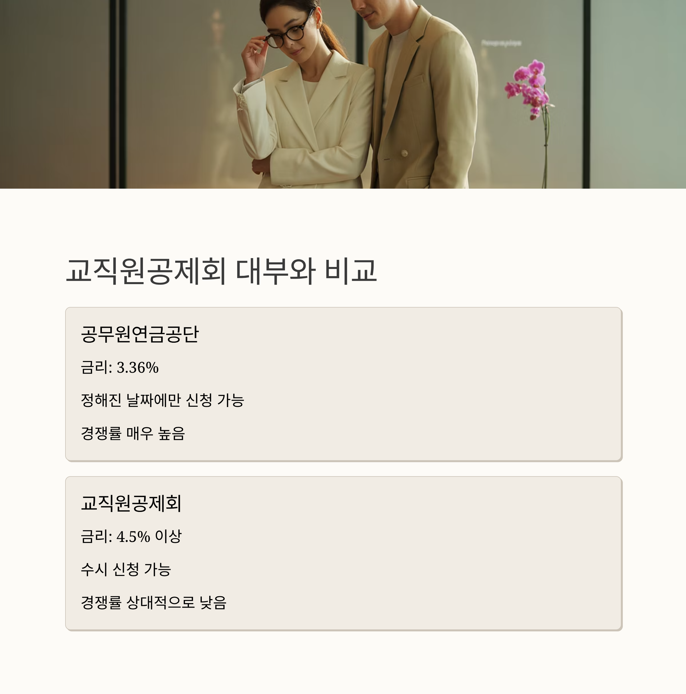 신청의 타이밍과 준비도는 공무원연금공단, 자유로운 신청은 교직원공제회에 적합합니다.