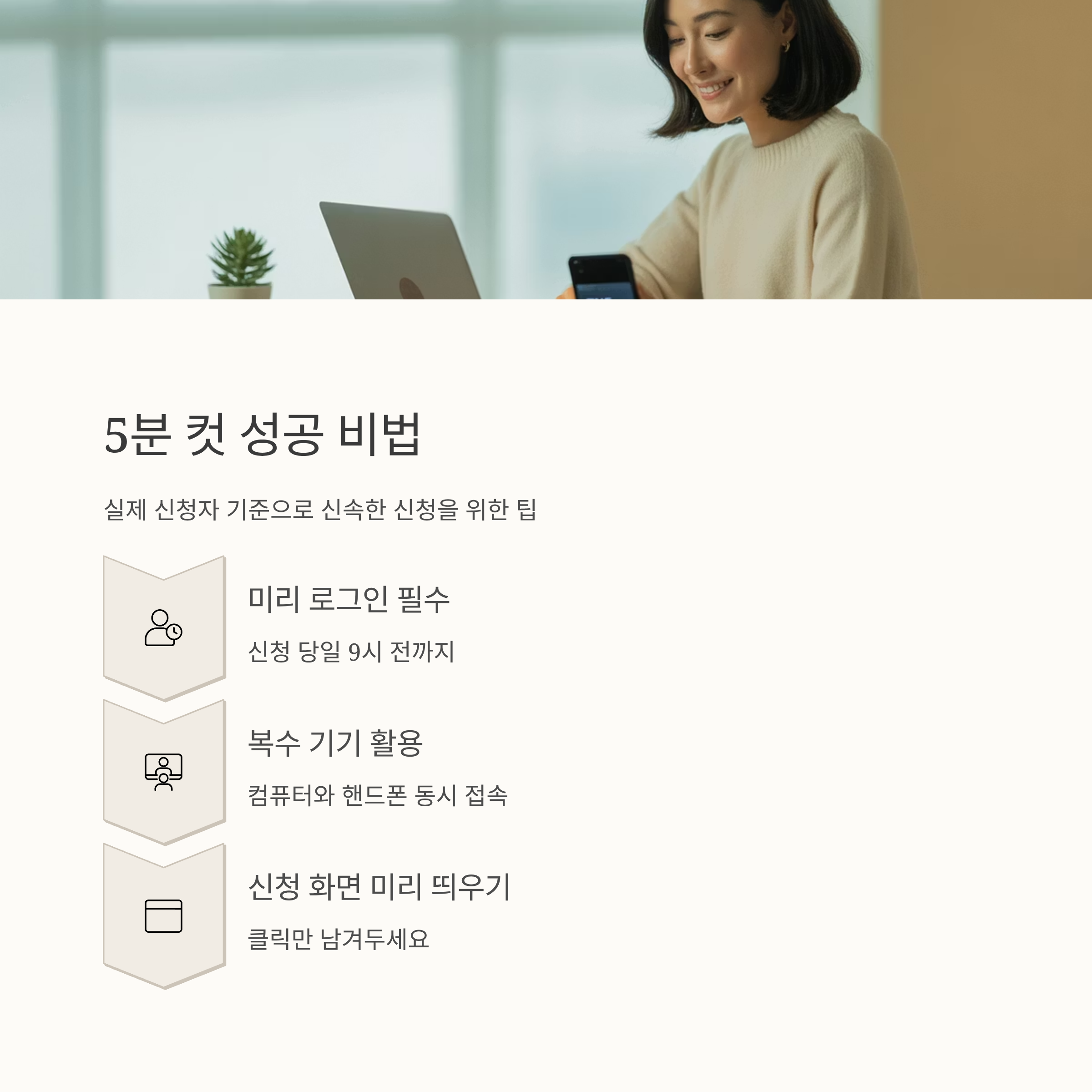 실제 신청자 기준으로 5분 컷 성공 비법을 요약하면 다음과 같습니다.
