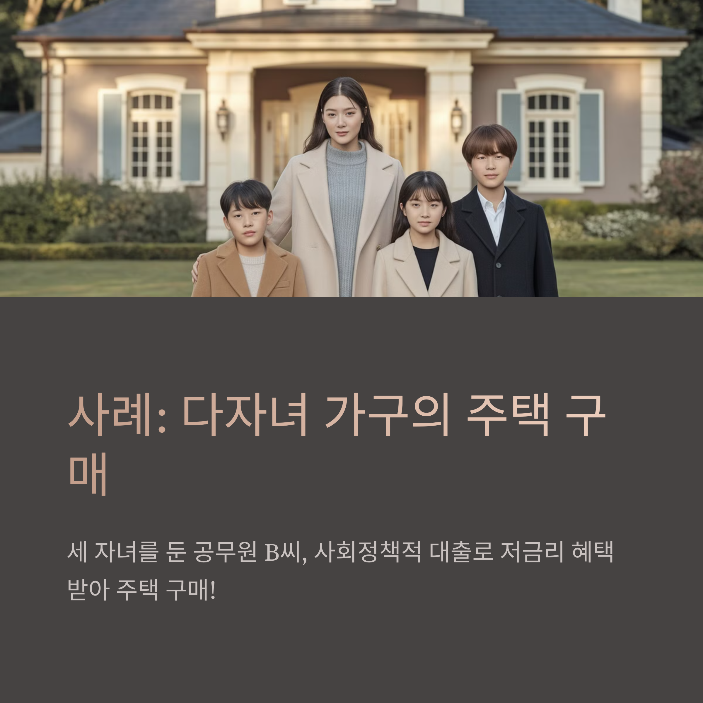 - 세 자녀를 둔 공무원 B씨는 대출 금리 부담이 컸으나 사회정책적 대출을 활용해 저금리 혜택을 받았습니다.
