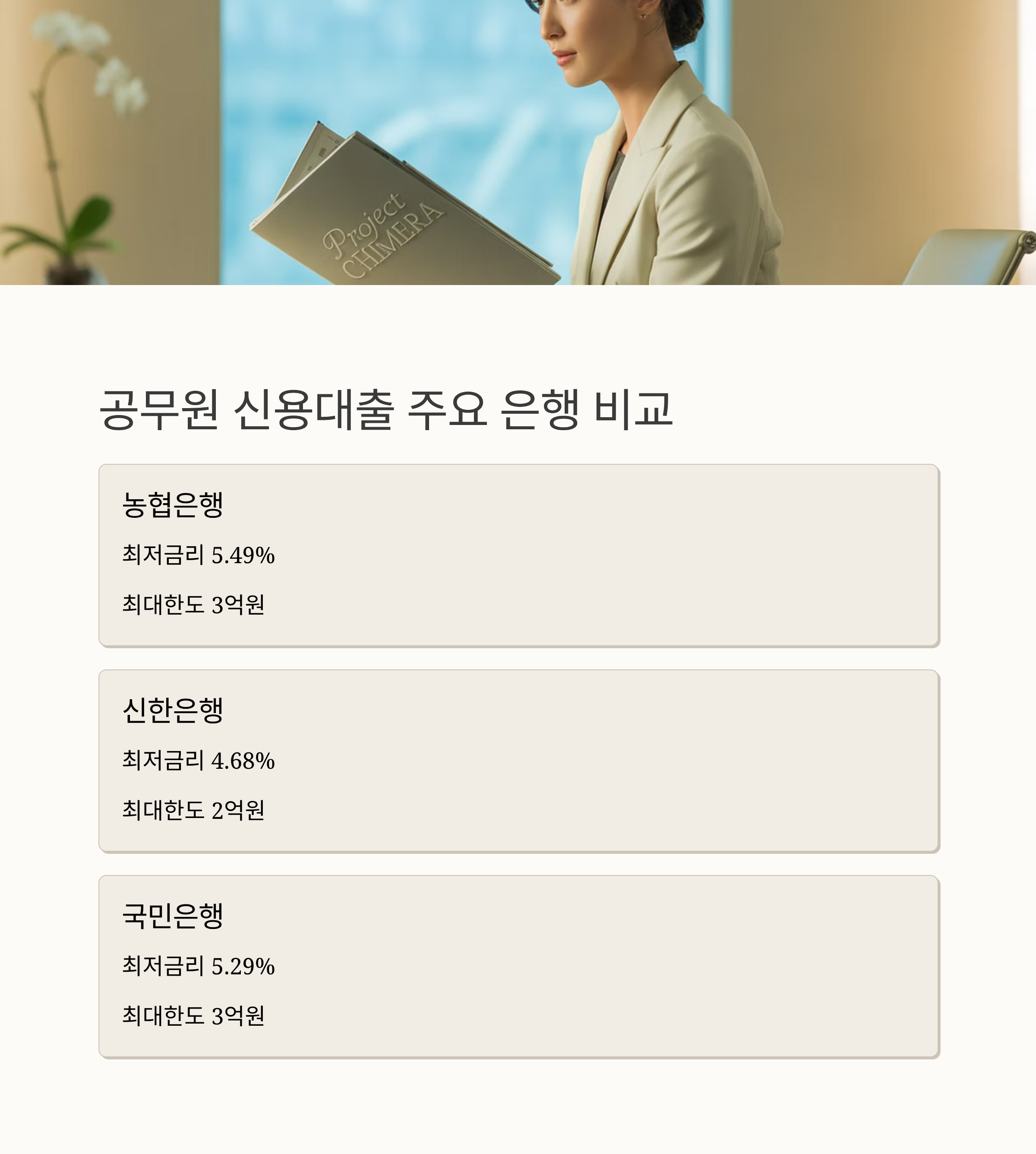 공무원 전용 신용대출은 주로 농협은행, 하나은행, 신한은행, 국민은행 등 제1금융권에서 제공됩니다.