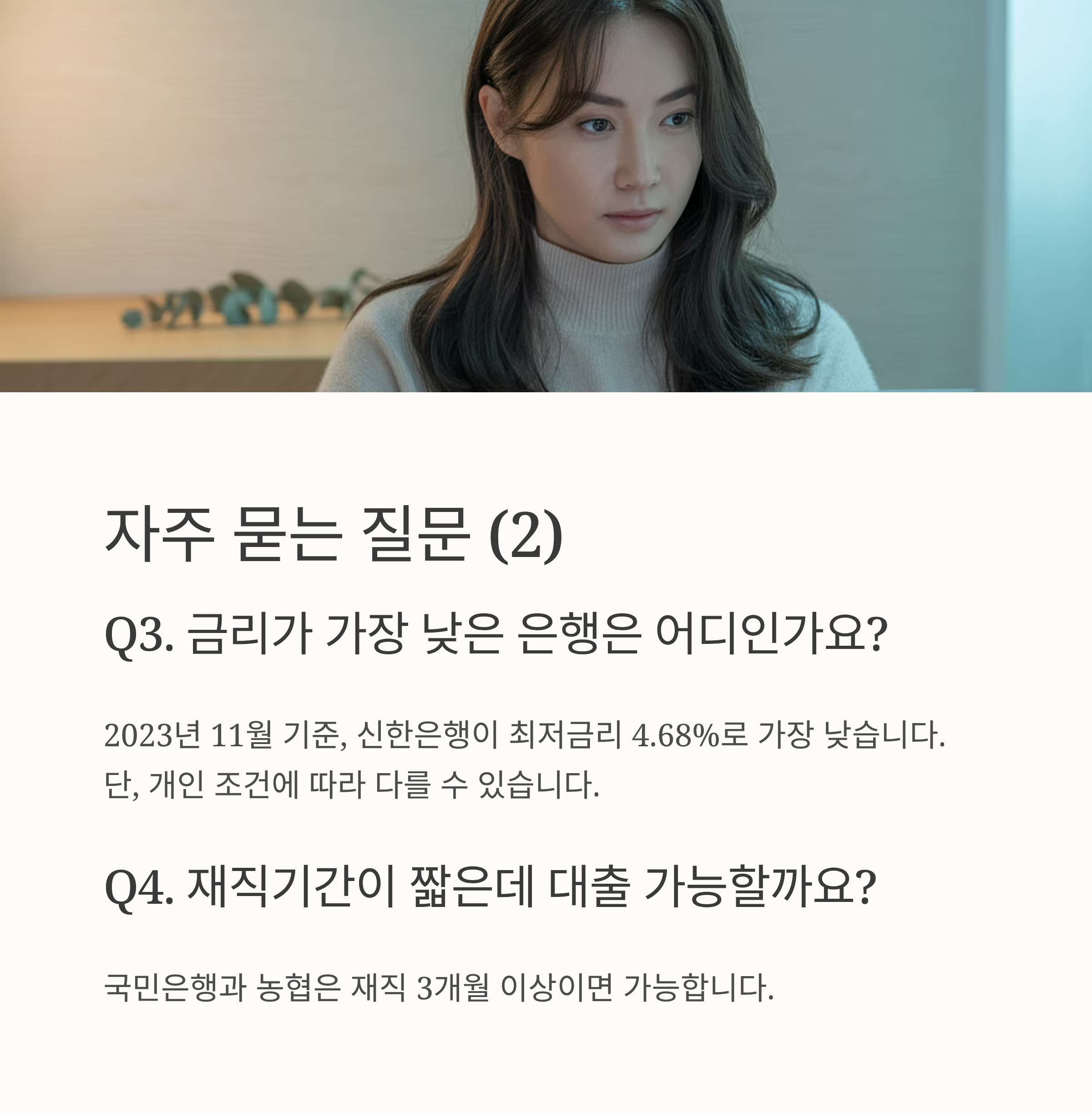 A3. 2023년 11월 기준, 신한은행이 최저금리 4.68%로 가장 낮습니다. 단, 개인 조건에 따라 다를 수 있습니다.