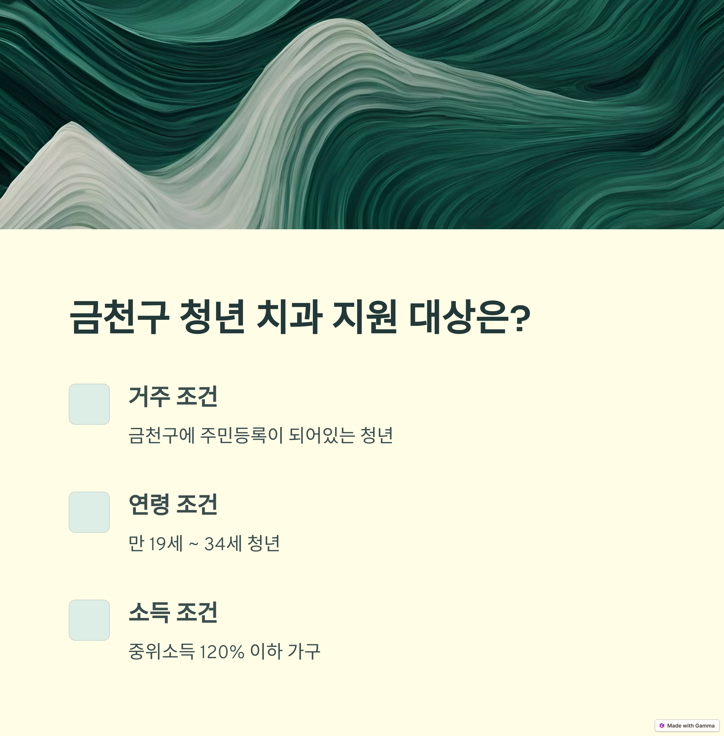 금천구 청년이라면 알아야 할 치과치료비 지원제도의 신청 조건, 지원 내용, 신청 방법 등을 상세히 안내해 드리겠습니다.