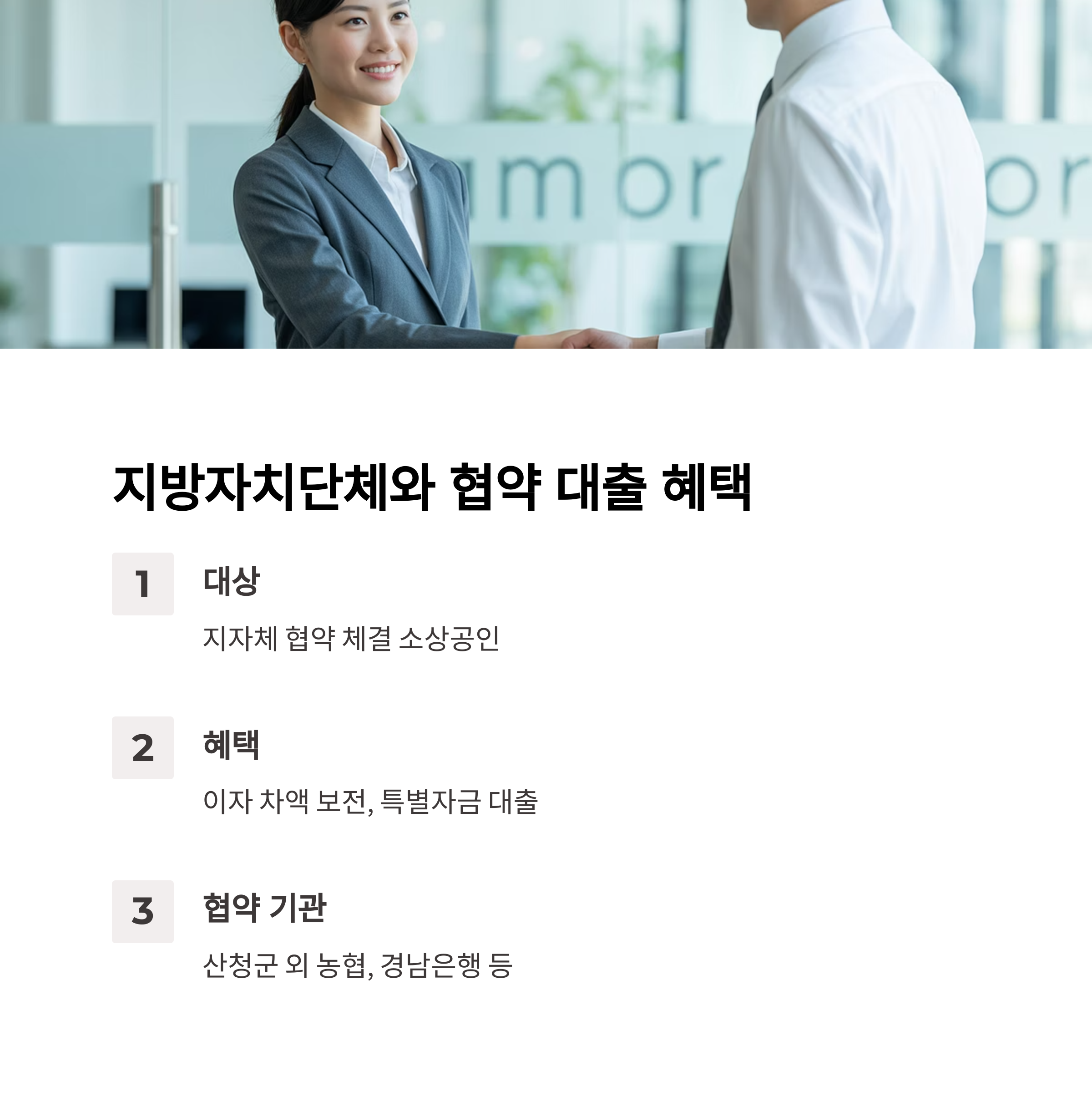 산청군 등 지방자치단체와의 협약을 통해 소상공인을 위한 특별 지원 프로그램이 운영됩니다.