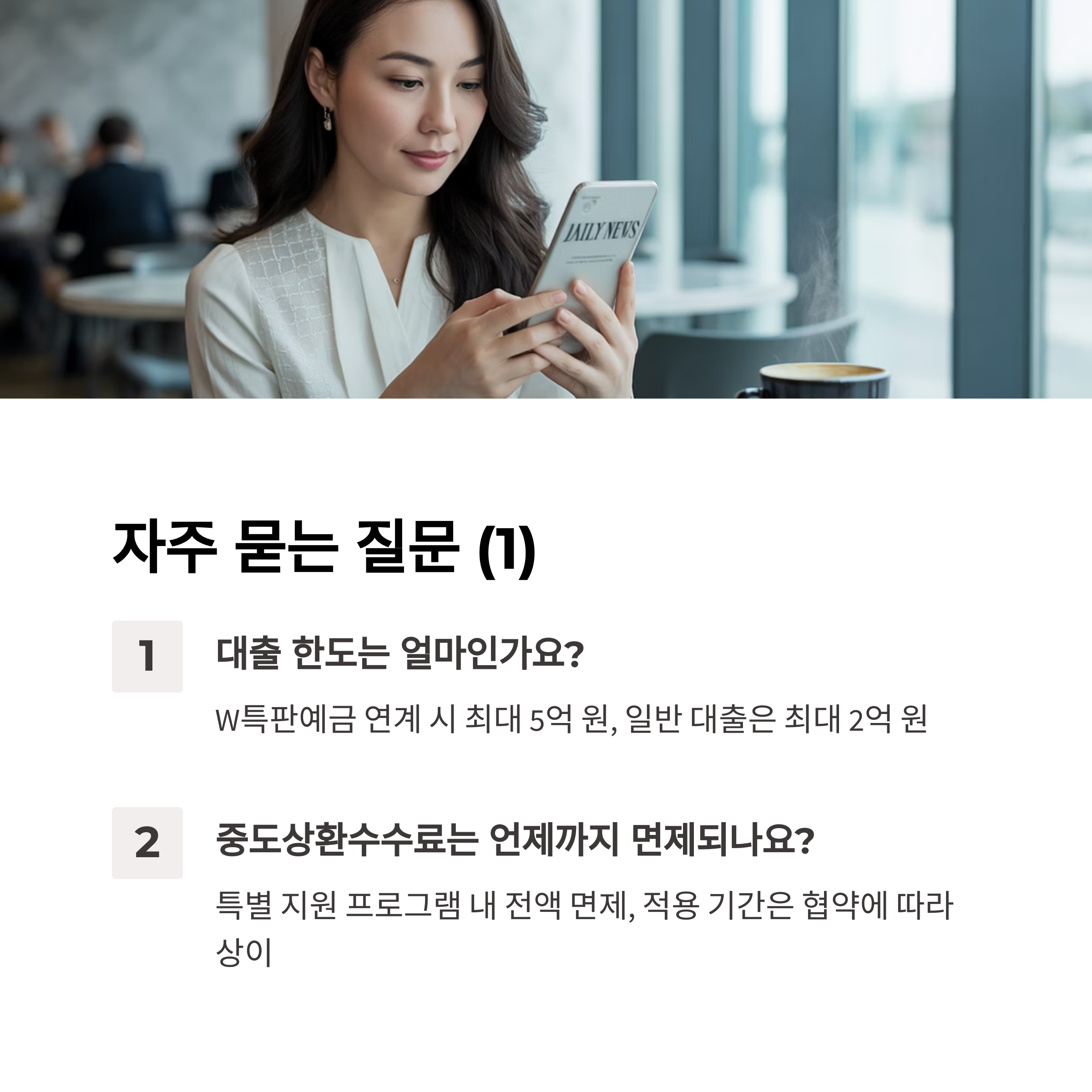 A1. W특판예금 연계 시 최대 5억 원, 일반 대출은 최대 2억 원까지 가능합니다.