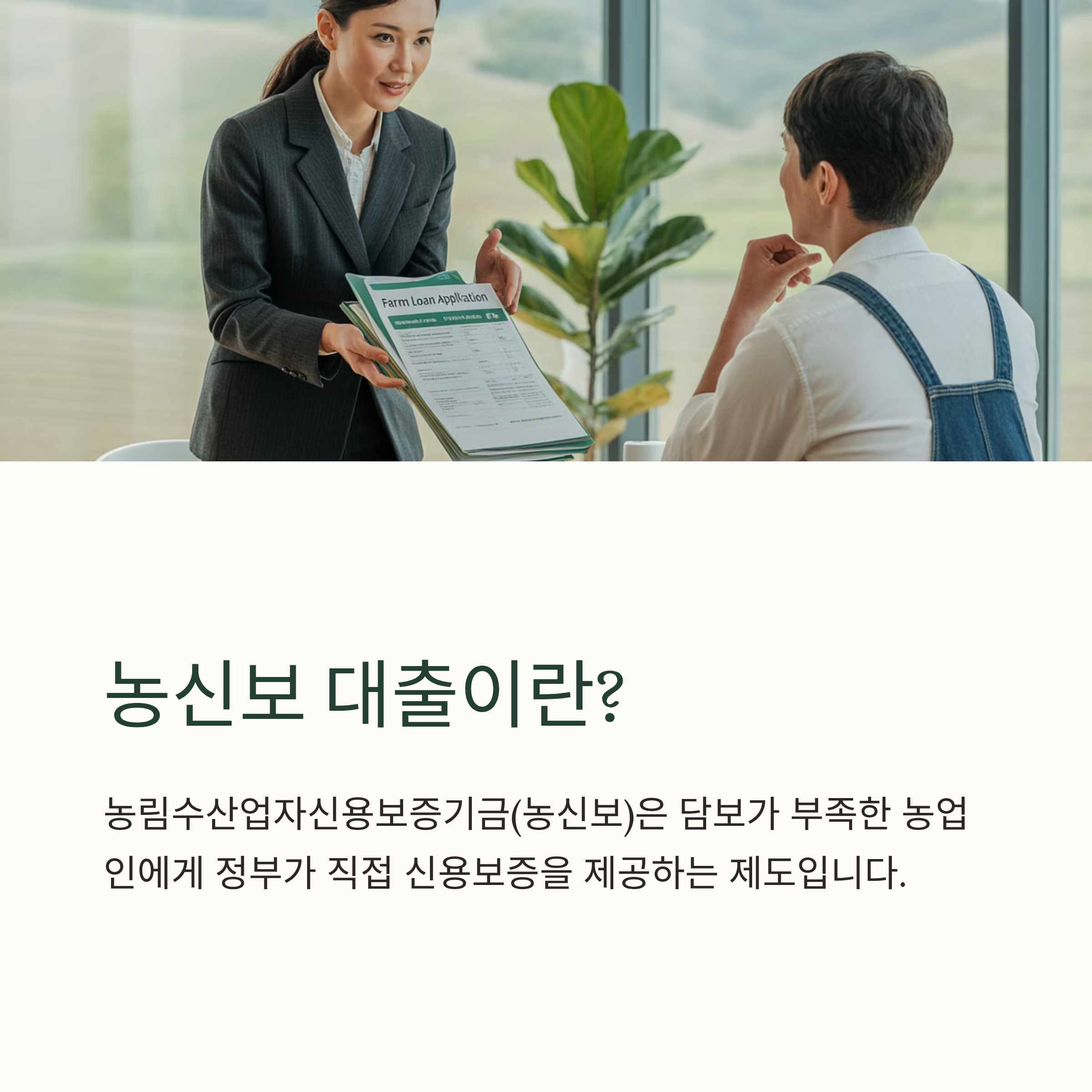 농림수산업자신용보증기금(농신보)은 담보가 부족한 농업인에게 정부가 직접 신용보증을 제공하는 제도입니다.