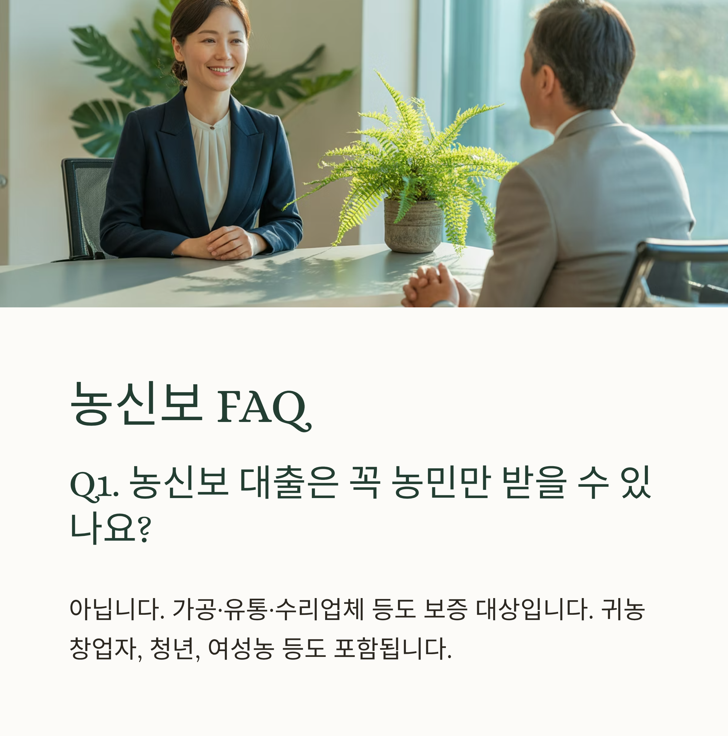 A1. 아닙니다. 가공·유통·수리업체 등도 보증 대상입니다. 귀농 창업자, 청년, 여성농 등도 포함됩니다.