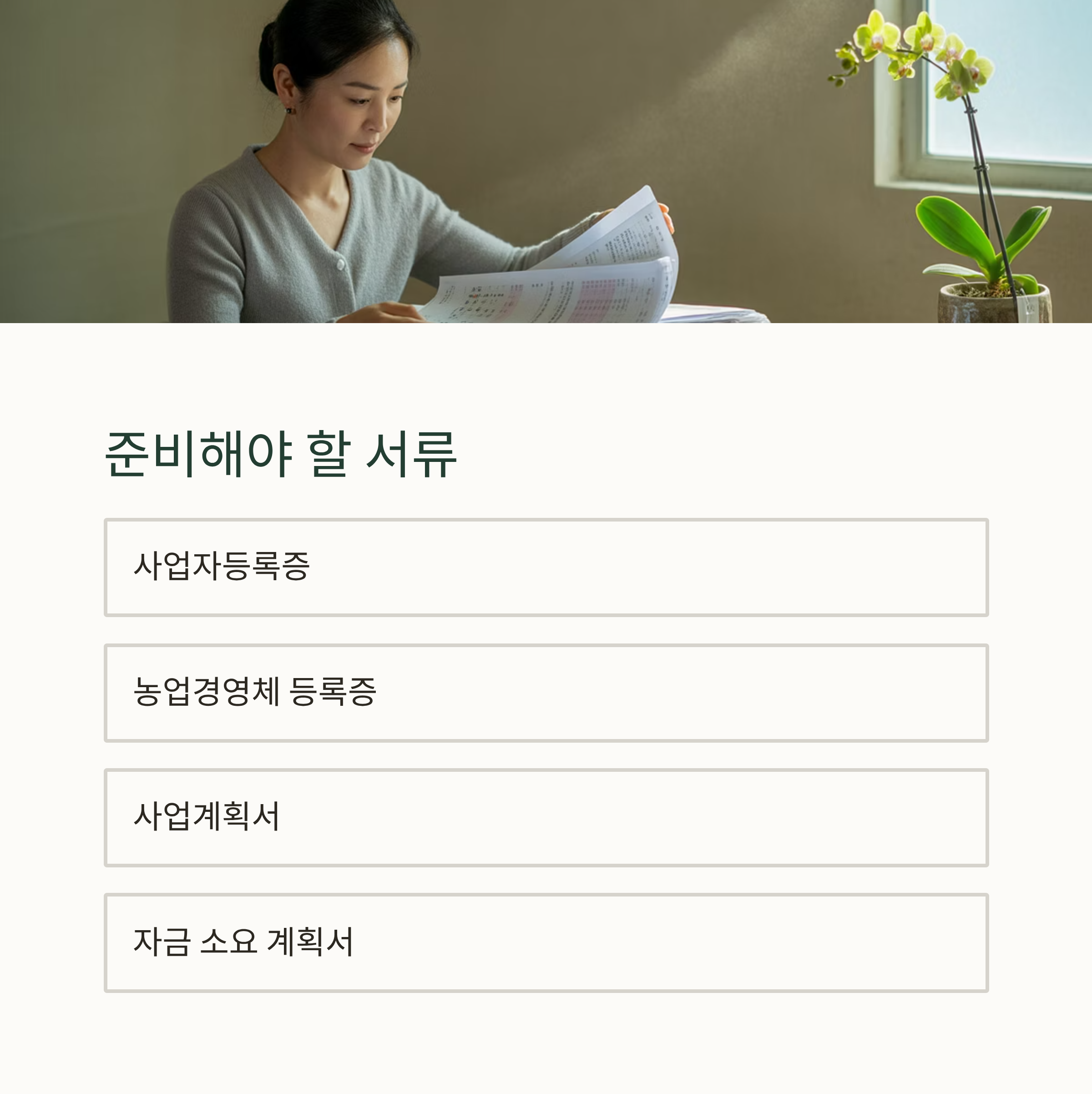 - 사업자 등록, 농업경영체 여부, 자금 규모 확인