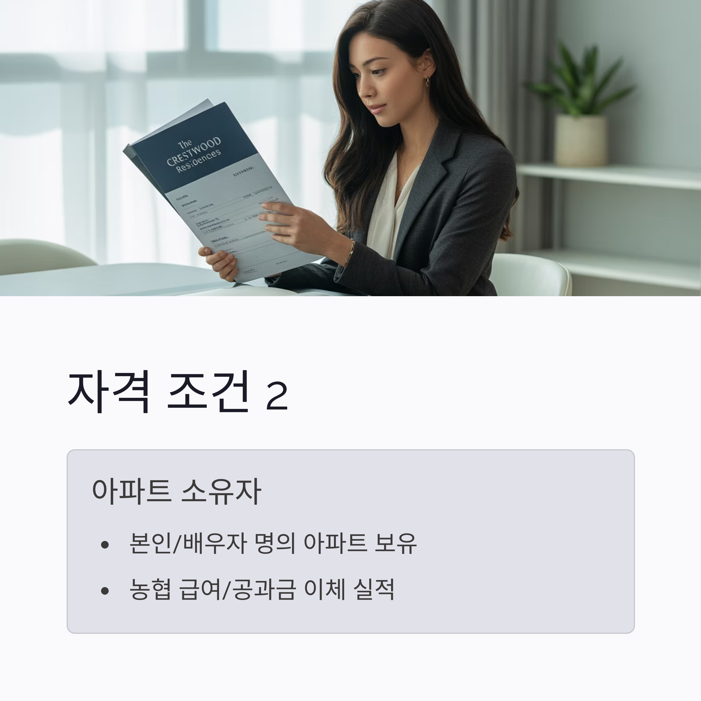 - 농협으로 급여 또는 공과금(아파트관리비 포함) 이체 실적 보유