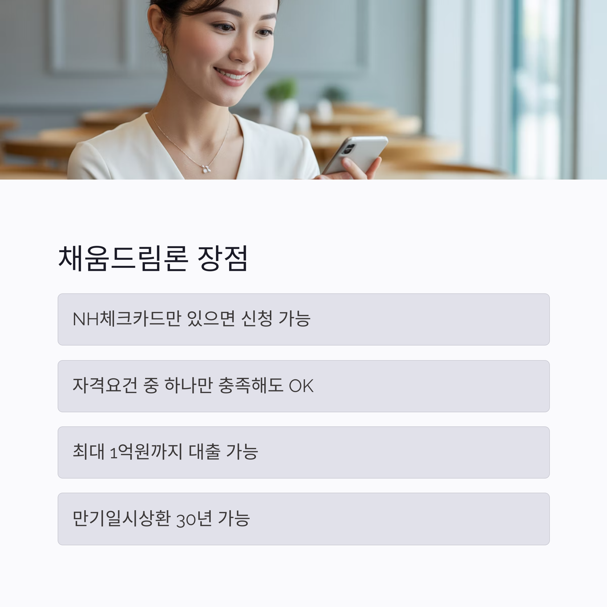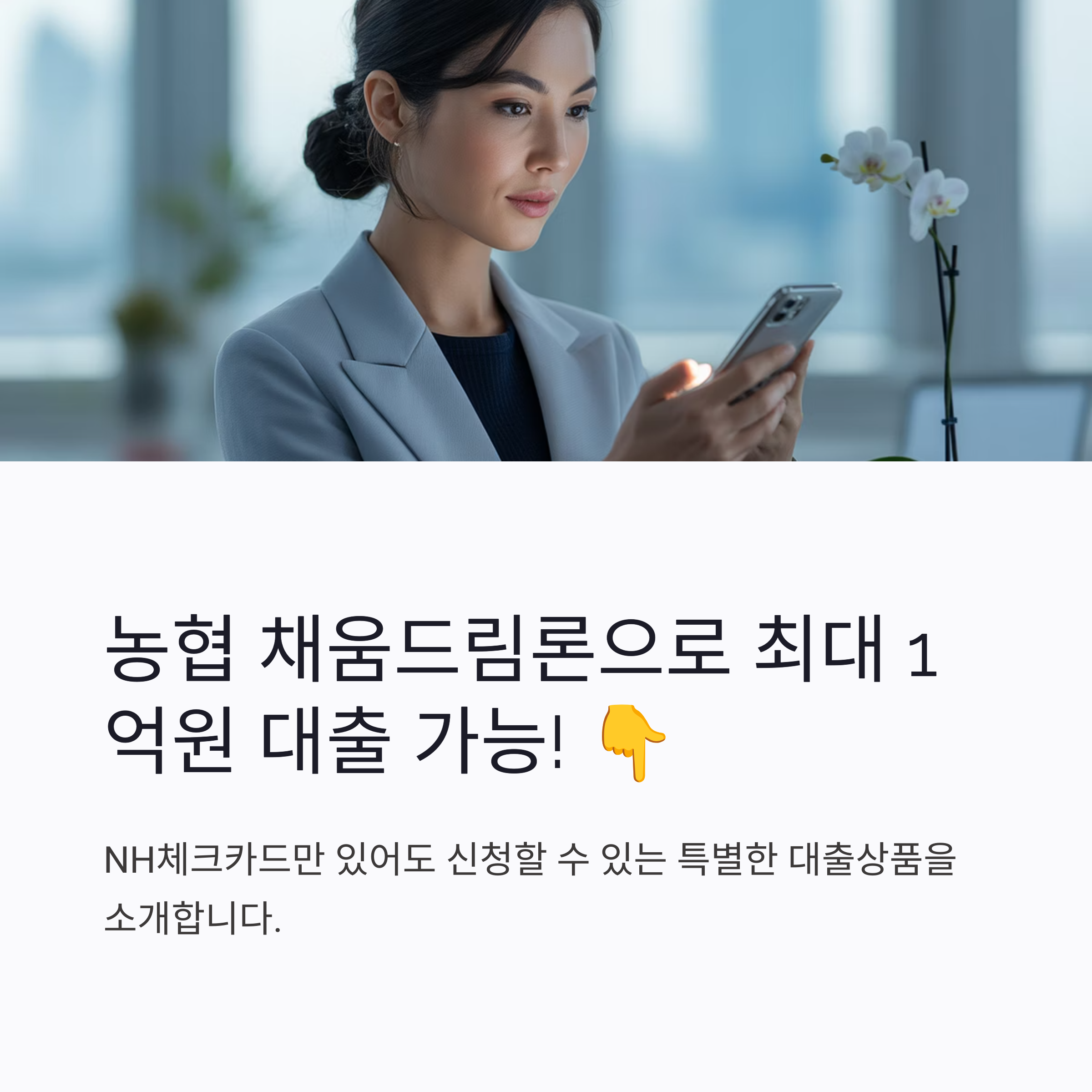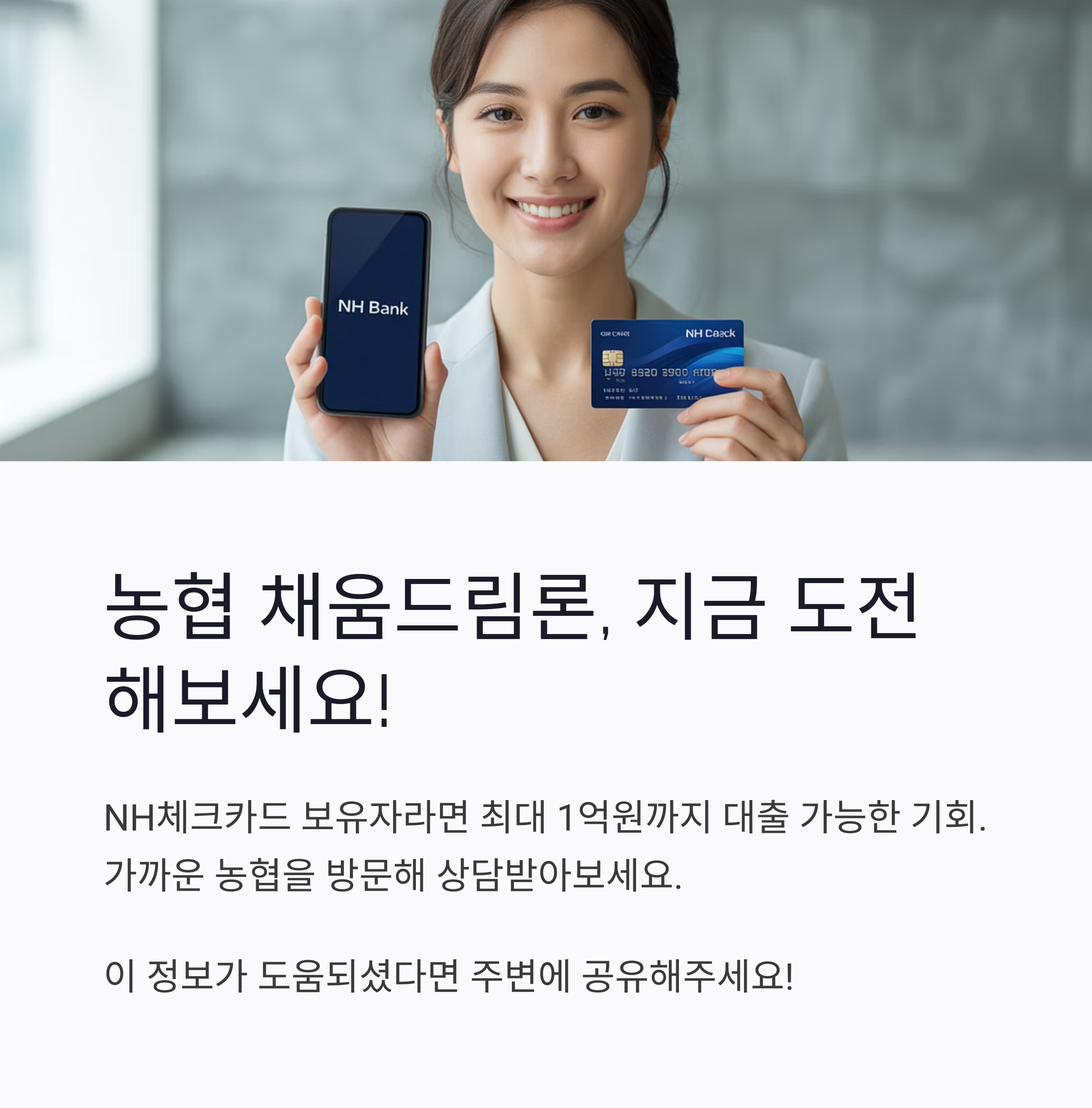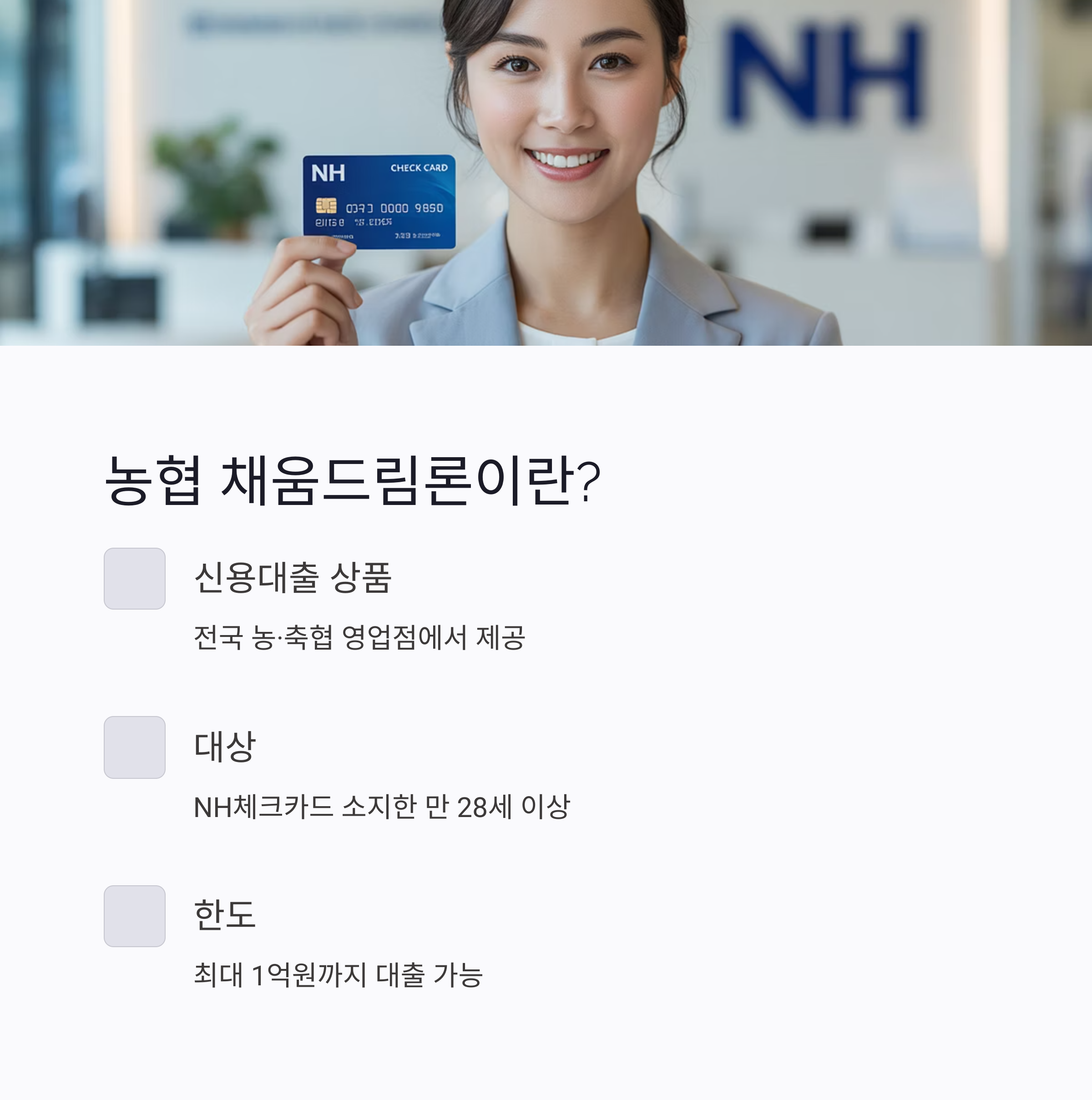2025년 현재, 특별한 자격 없이 NH체크카드만 있어도 신청할 수 있는 대출상품이 있습니다. 바로 농협 채움드림론인데요. 최대 1억원의 한도, 다양한 자격 조건, 그리고 장기 상환 가능 등 장점이 많습니다.