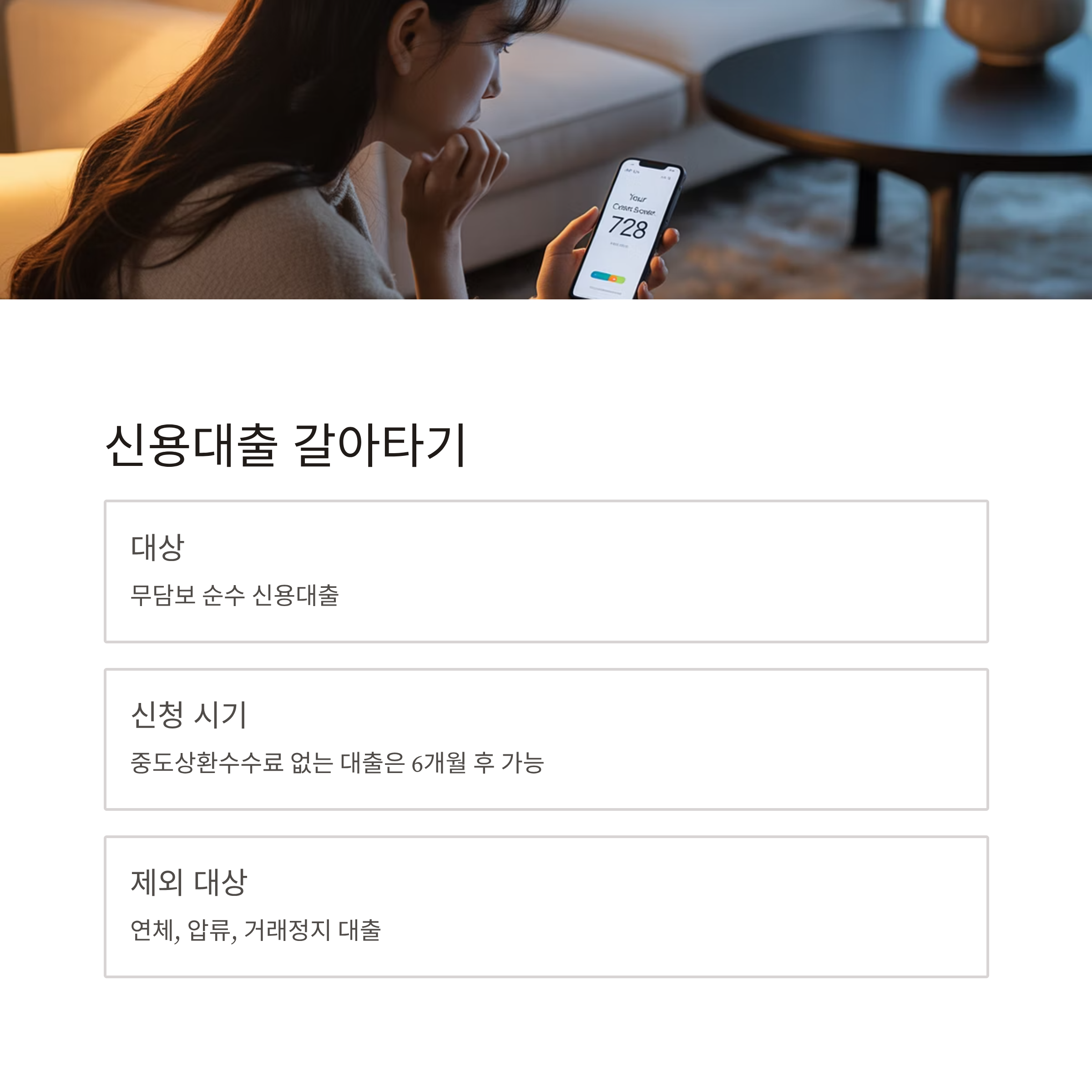 - 조건: 중도상환수수료 없는 대출은 6개월 후 가능