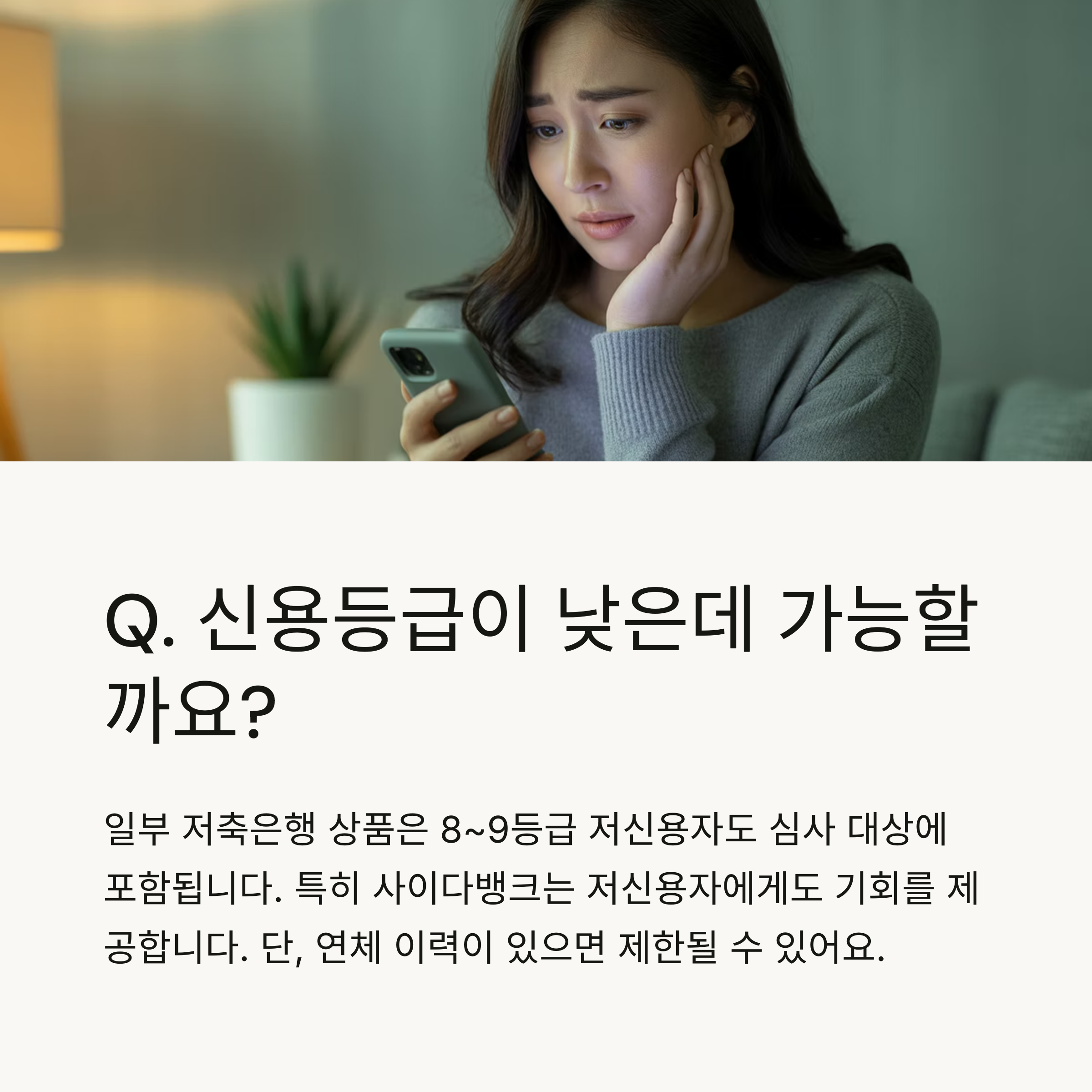 일부 저축은행 상품은 8~9등급 저신용자도 심사 대상에 포함됩니다. 단, 연체 이력이 있으면