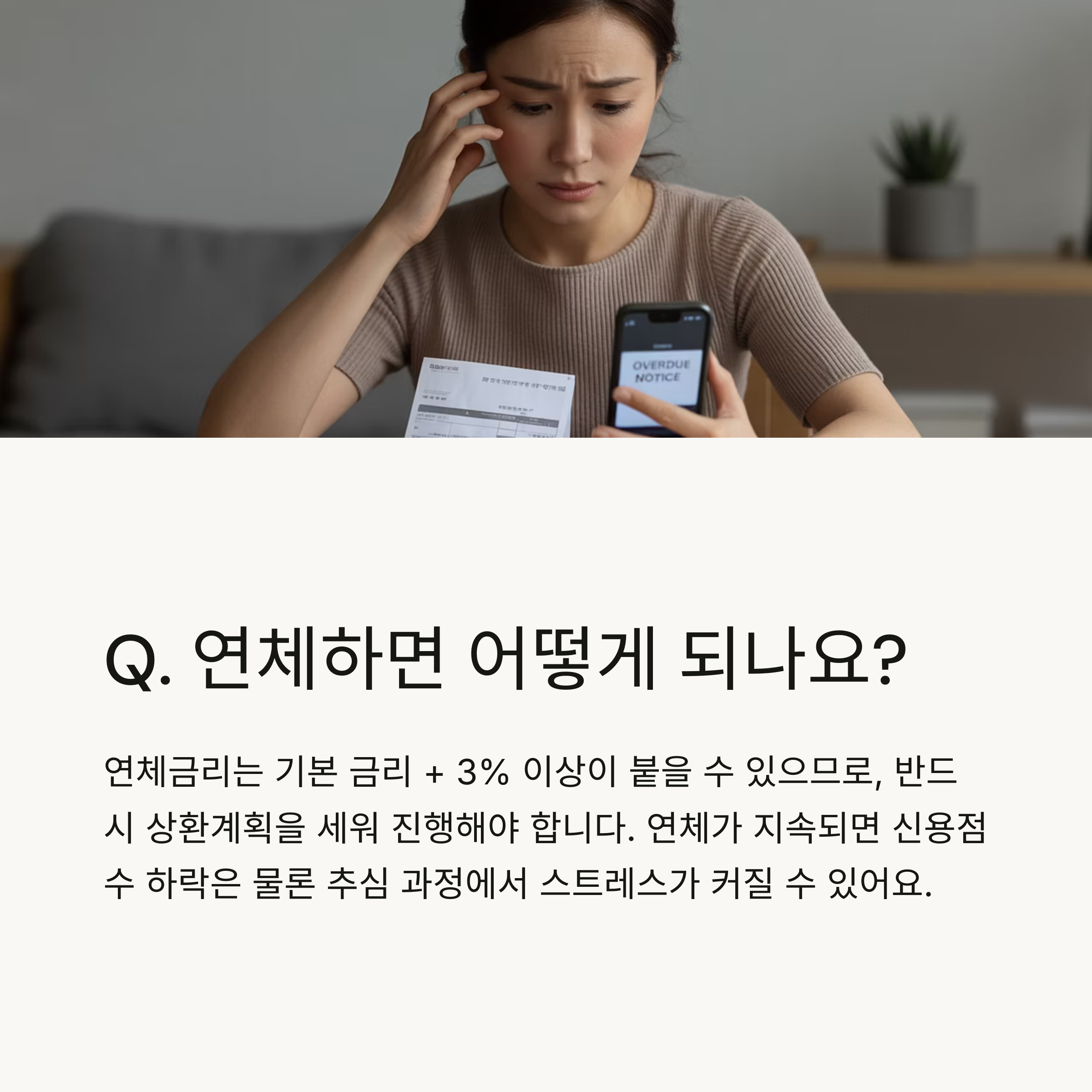 연체금리는 기본 금리 + 3% 이상이 붙을 수 있으므로, 반드시 상환계획을 세워 진행해야 합니다.