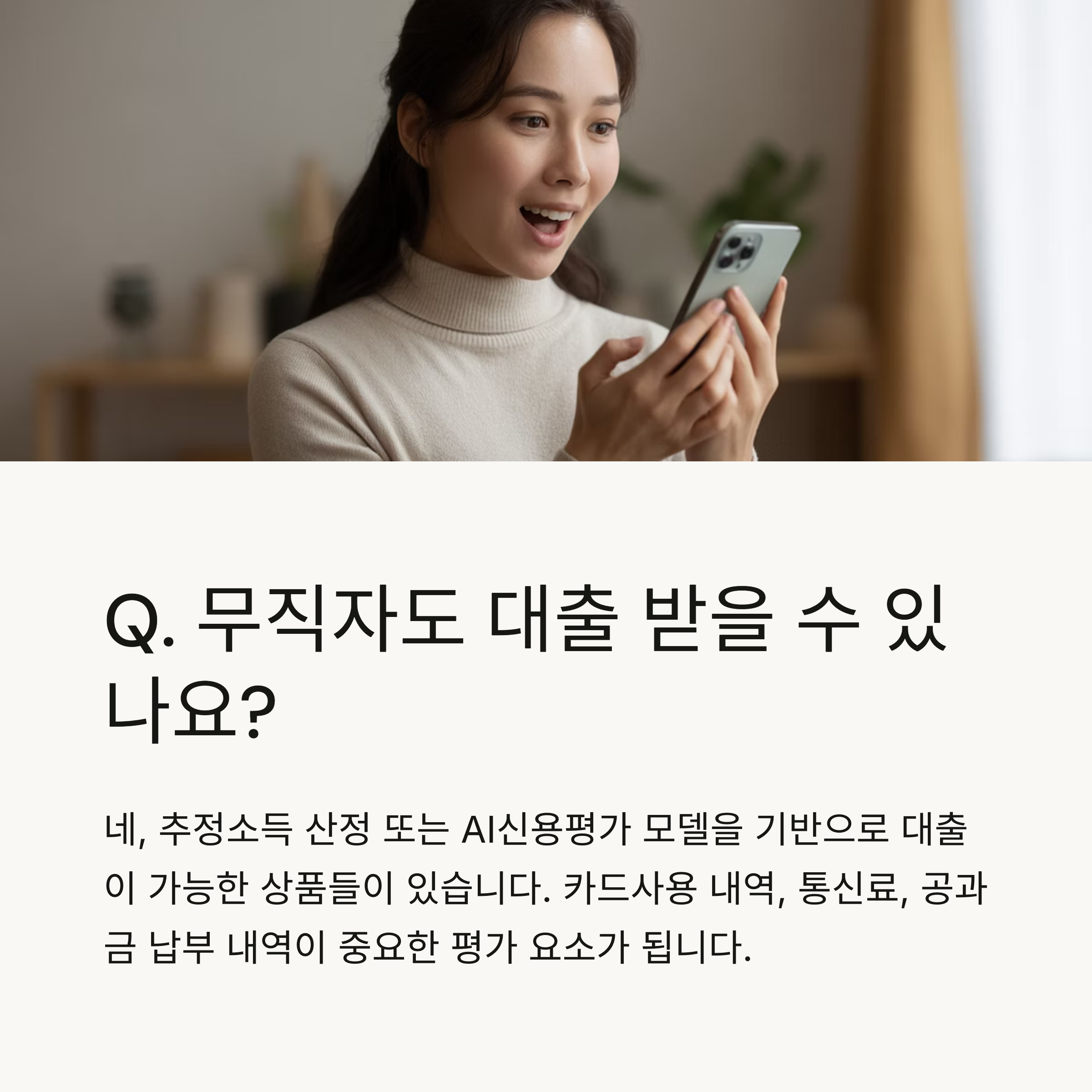 신용평가(AI 심사)를 통해 무직자도 대출 승인을 받을 수 있는 시스템이 마련되어 있습니다.