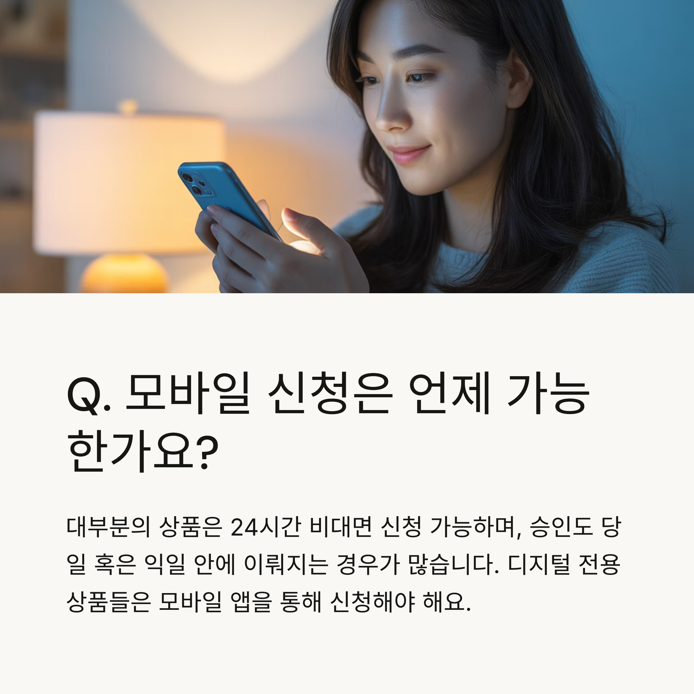 대부분의 상품은 24시간 비대면 신청 가능하며, 승인도 당일 혹은 익일 안에 이뤄지는 경우가 많습니다.