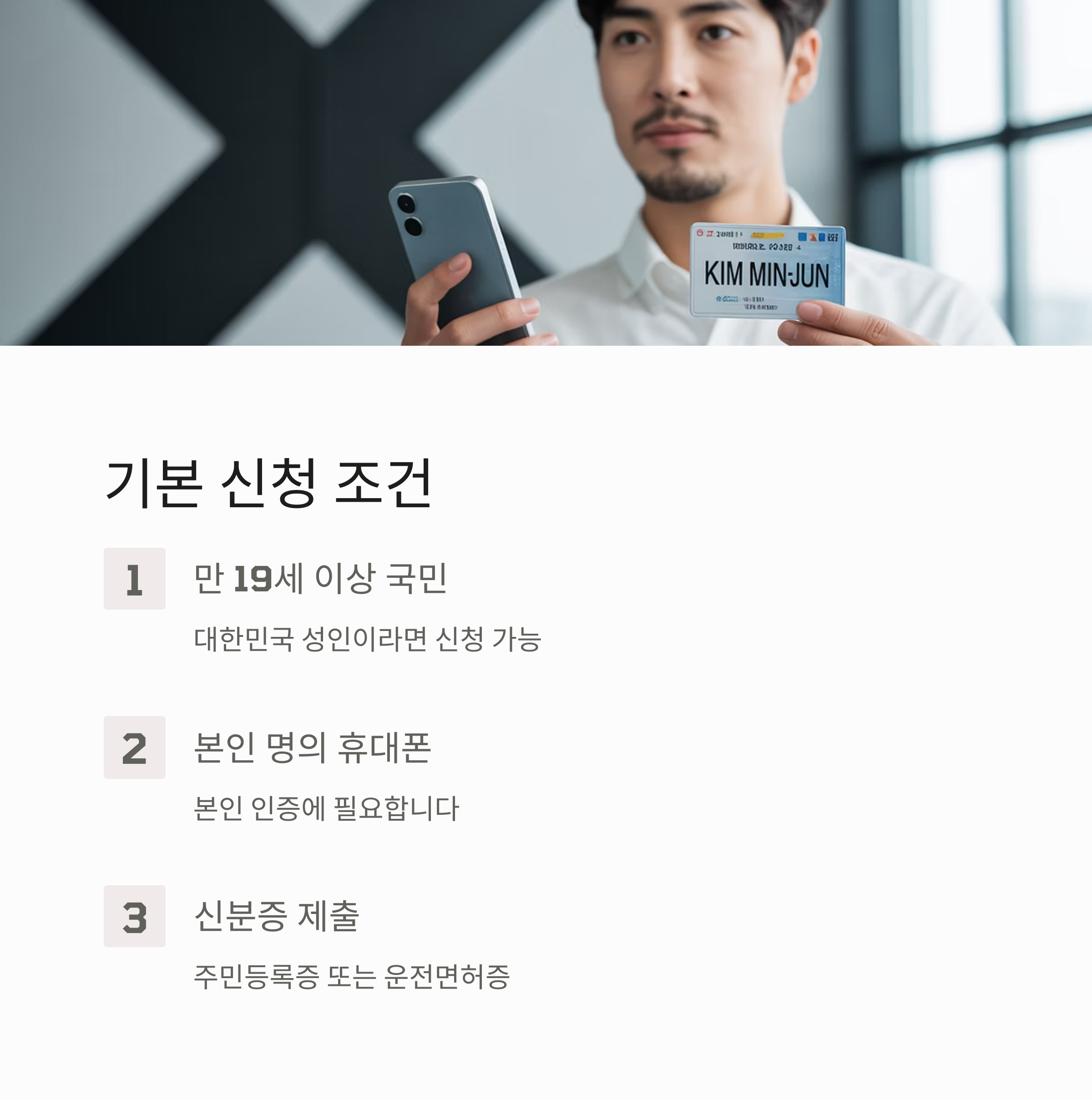 본인 명의 휴대폰 인증 → 주민등록증 또는 운전면허증 사진 제출
