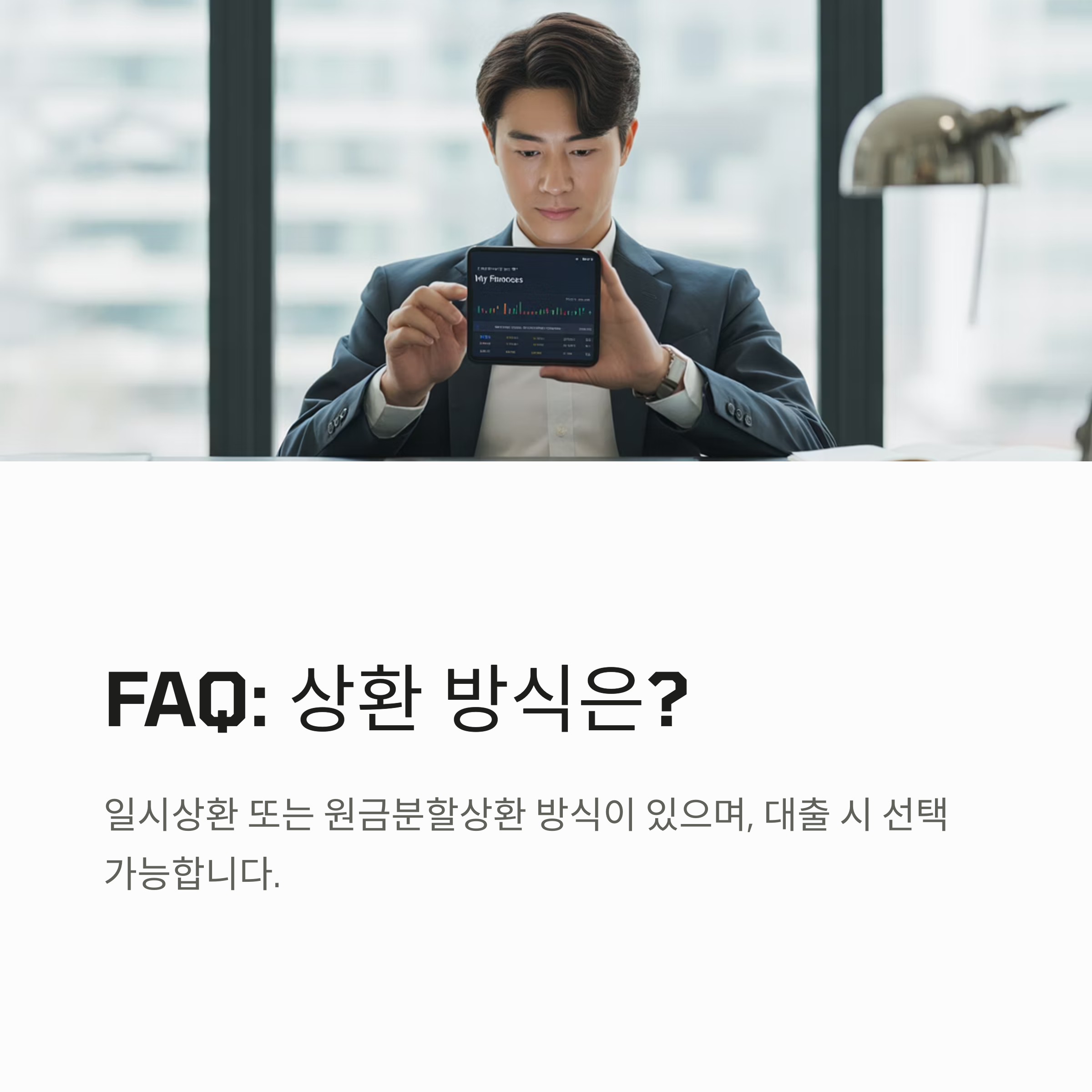 A5. 일시상환 또는 원금분할상환 방식이 있으며, 대출 시 선택 가능합니다. 반드시 기간 내 상환을 지켜야 합니다.