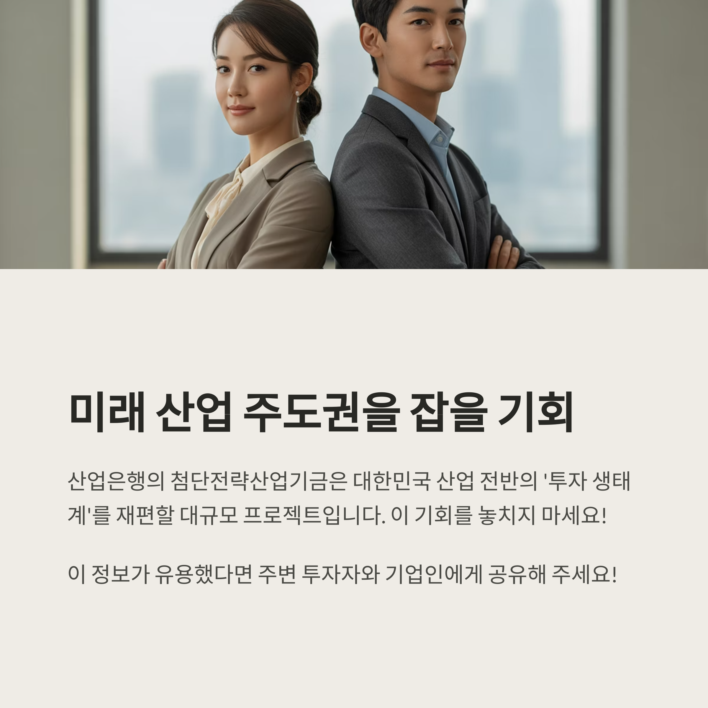 산업은행의 첨단전략산업기금 신설은 대한민국 산업 전반의 ‘투자 생태계’를 재편할 대규모 프로젝트입니다. 대출 중심의 패시브 금융에서 벗어나, 산업 경쟁력 강화를 위한 전략적 투자로 전환하는 이 기회를 놓치지 마세요. 미래 산업 주도권을 잡고 싶은 기업과 투자자라면 반드시 주목해야 할 변화입니다.
