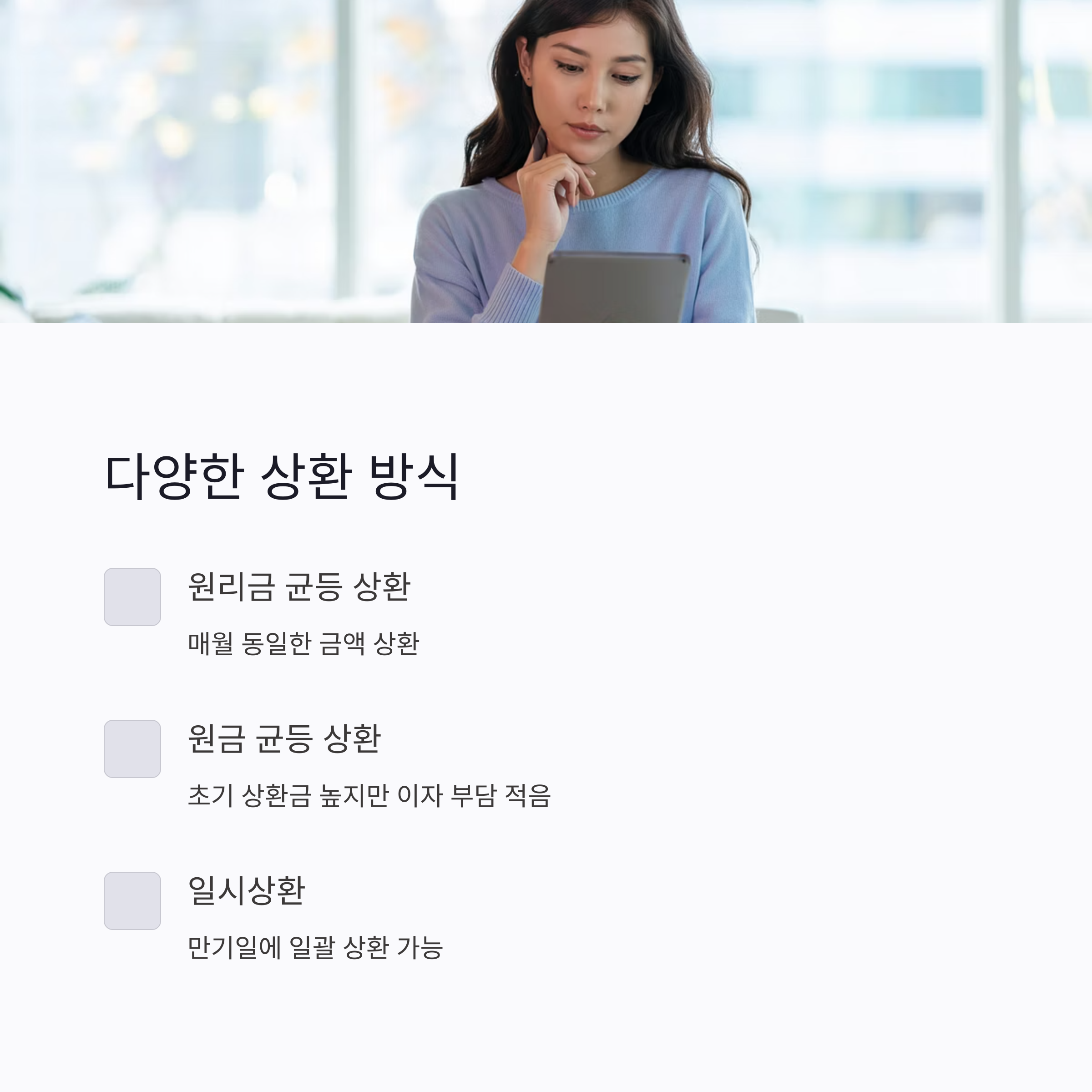 고객의 편의에 따라 상환 방식을 다양하게 선택할 수 있습니다.