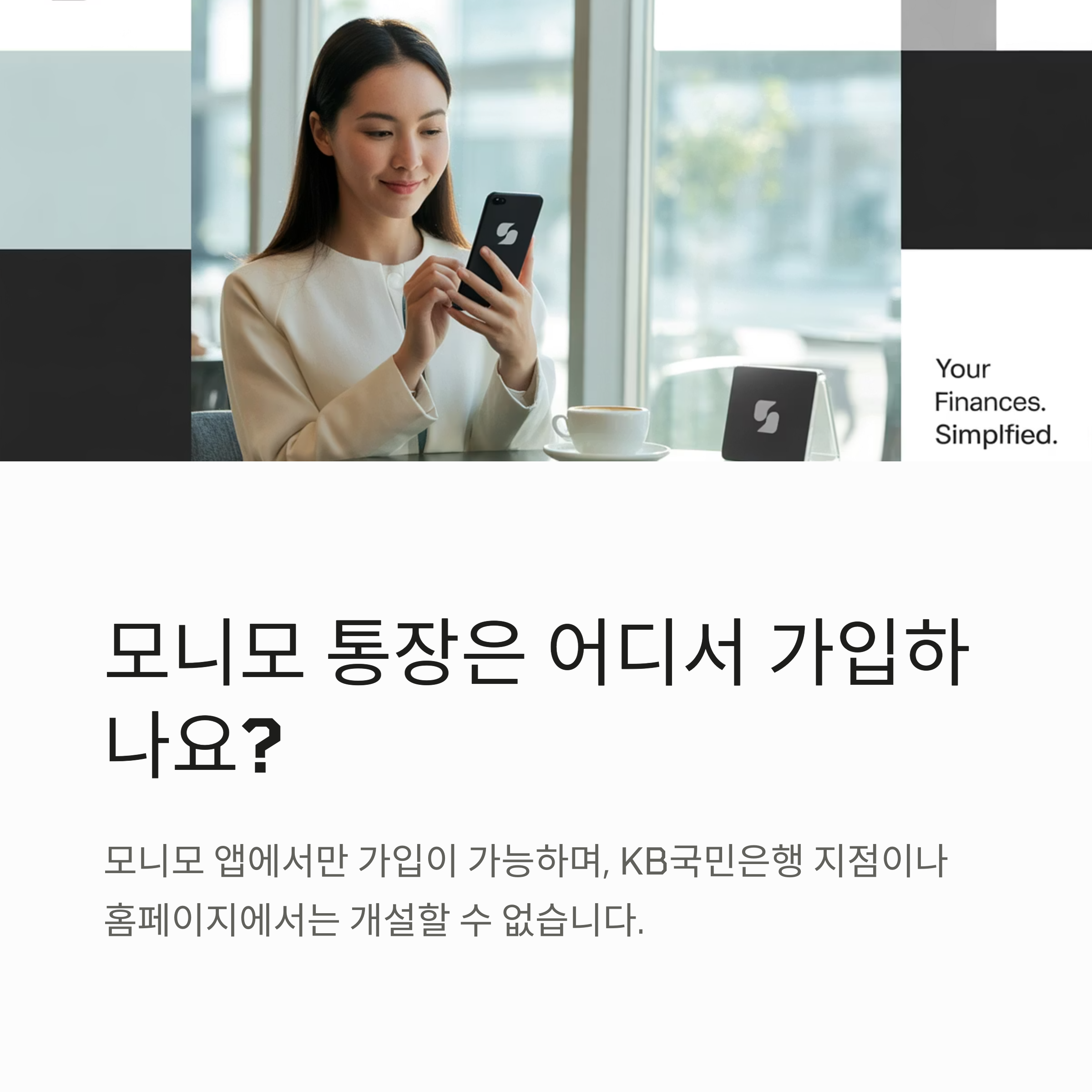 A1. 모니모 앱에서만 가입이 가능하며, KB국민은행 지점이나 홈페이지에서는 개설할 수 없습니다.