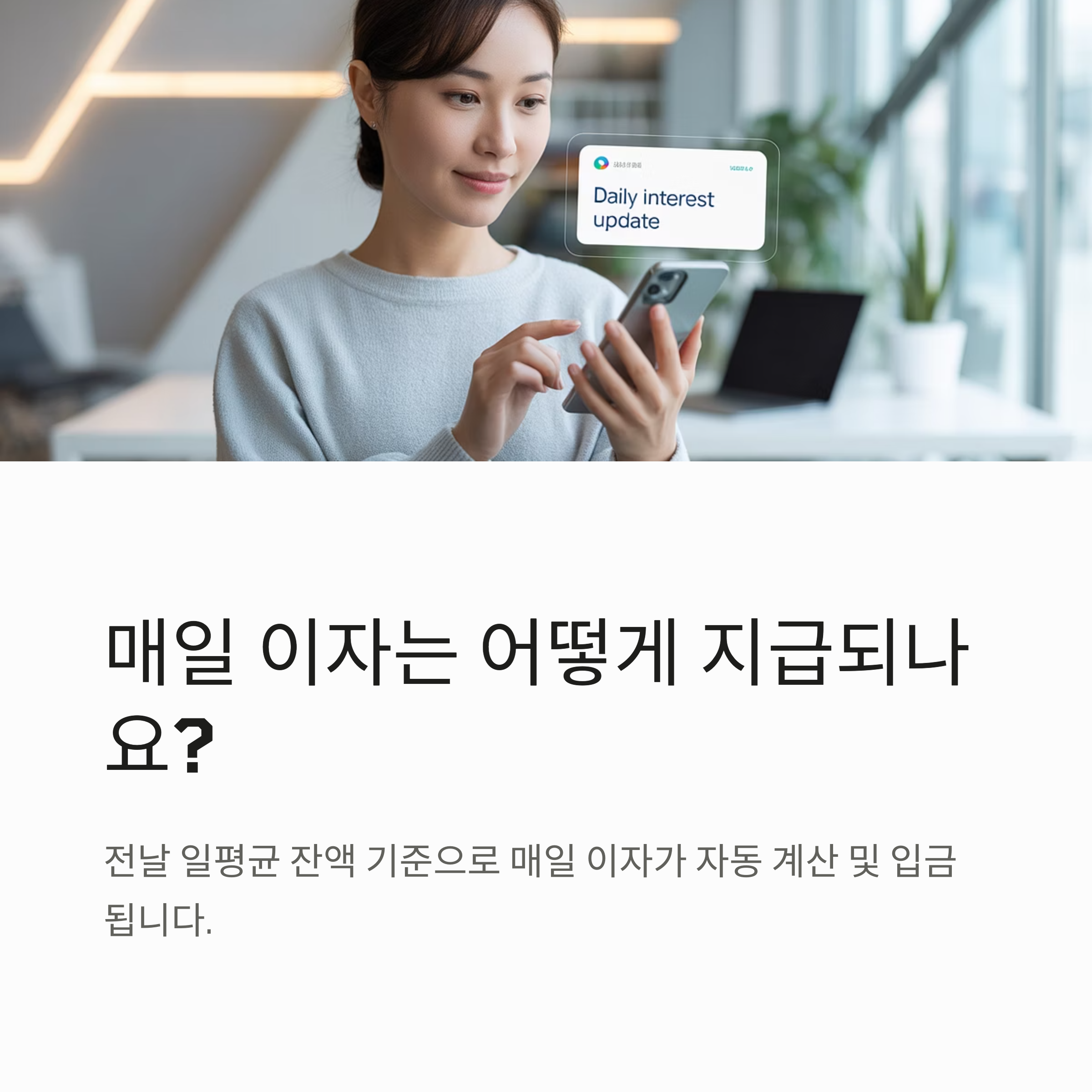 | 이자 지급 방식 | 매일 지급 (하루만 예치해도 이자 발생) |
