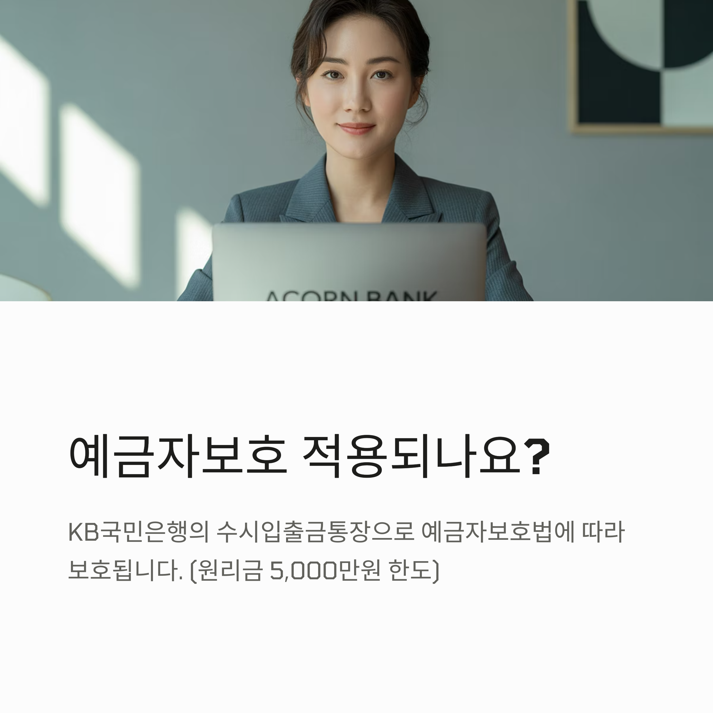 A7. KB국민은행의 수시입출금통장 상품이므로 예금자보호법에 따라 보호됩니다. (원리금 5,000만원 한도 내)