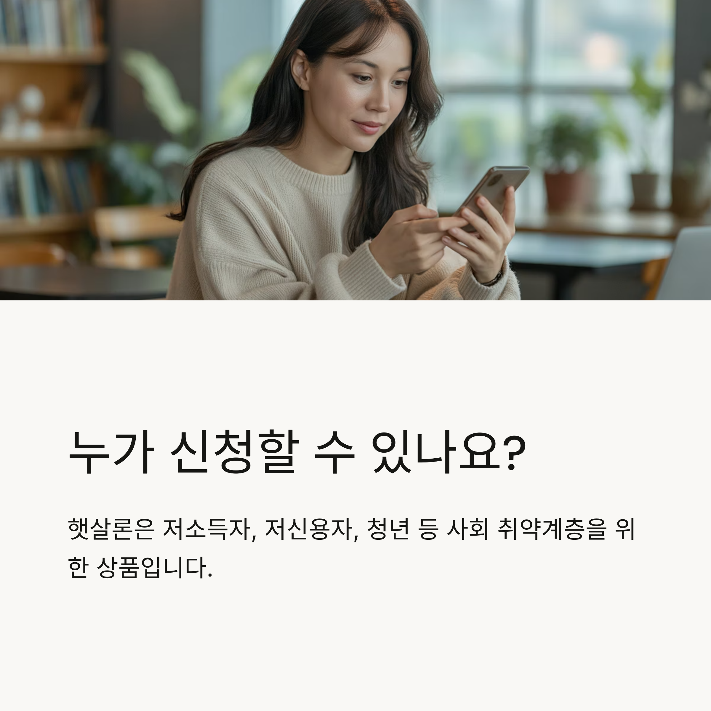 햇살론은 저소득자, 저신용자, 청년 등 사회 취약계층에게 열려 있습니다.