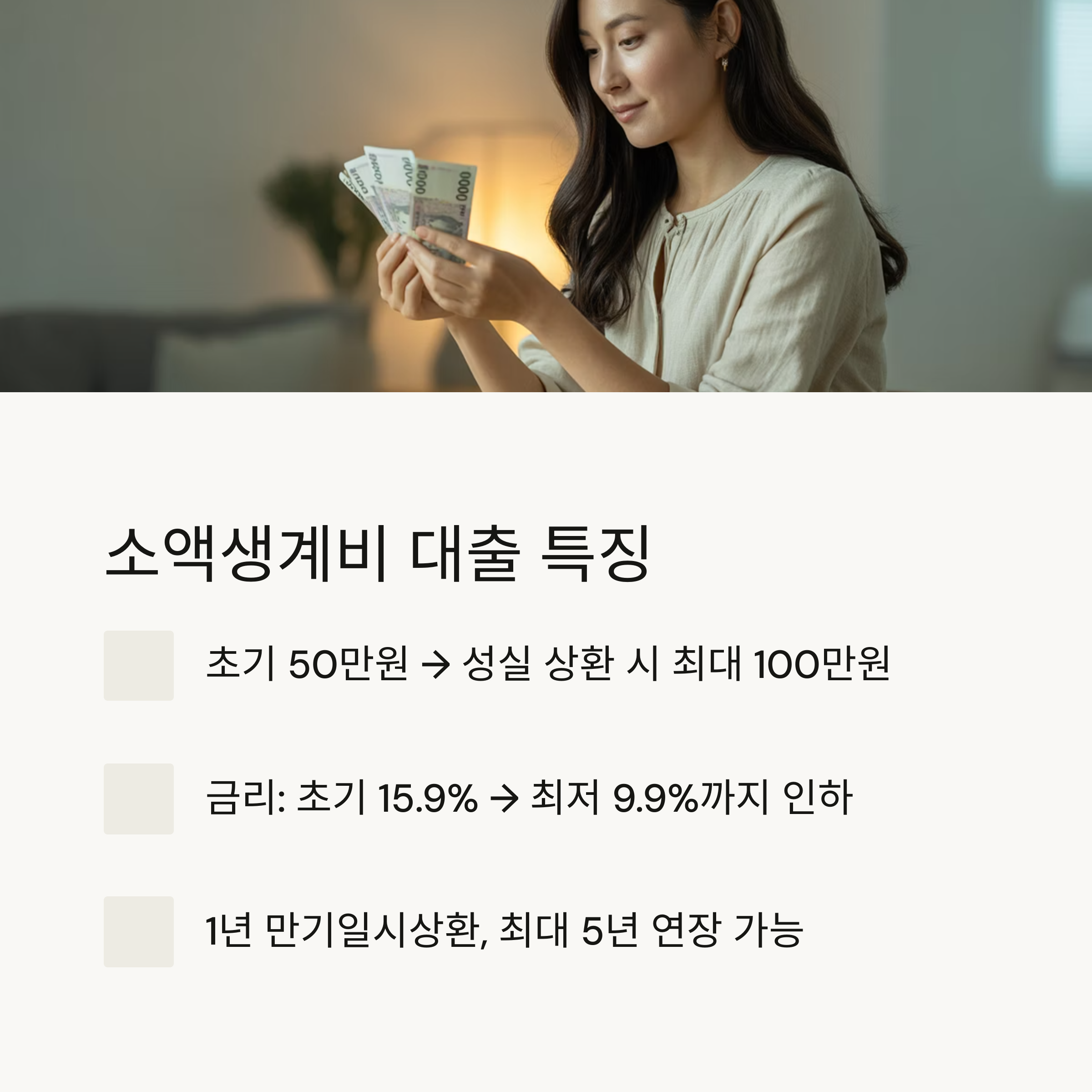 ✔ 대출 금액: 초기 50만원 → 성실 상환 시 최대 100만원까지 가능