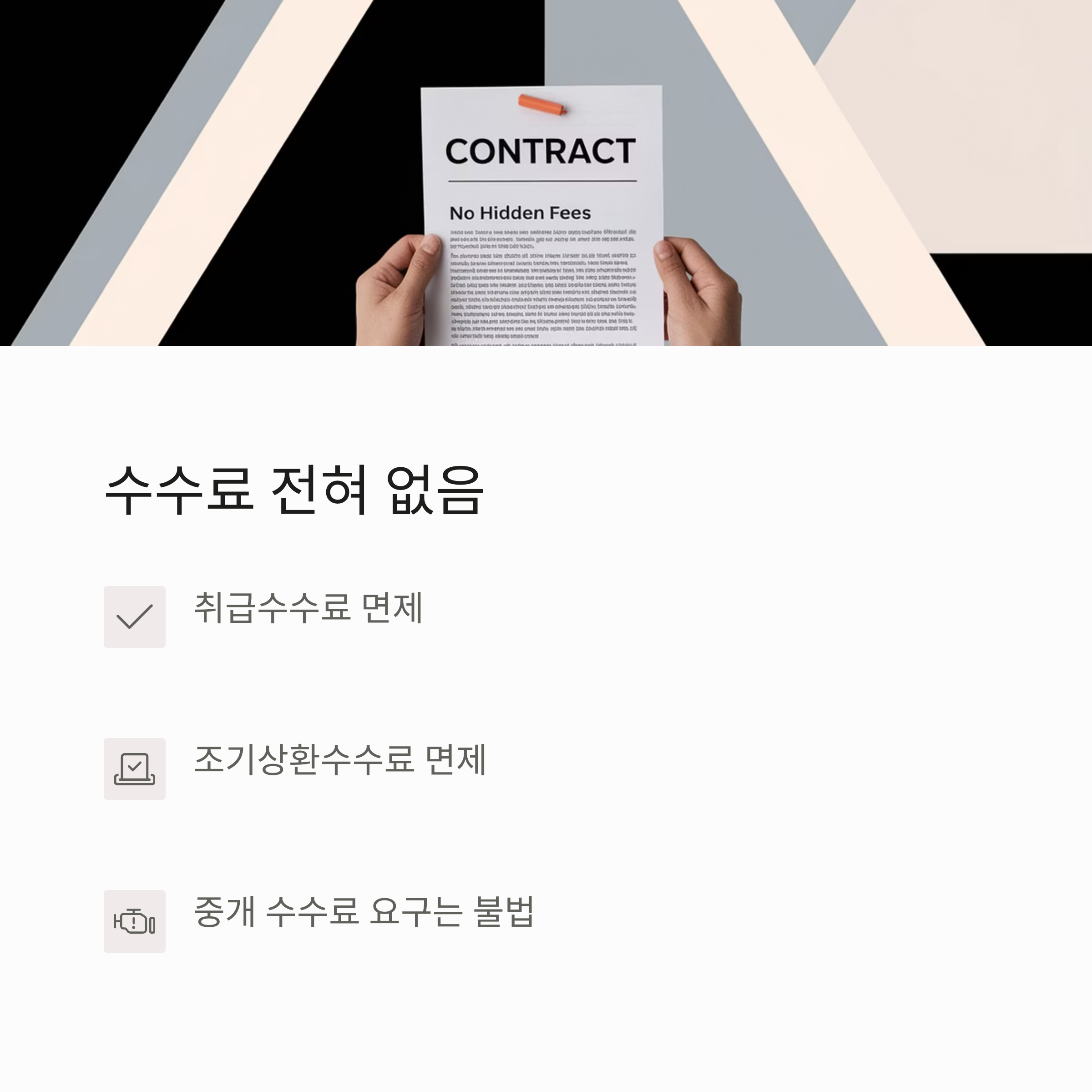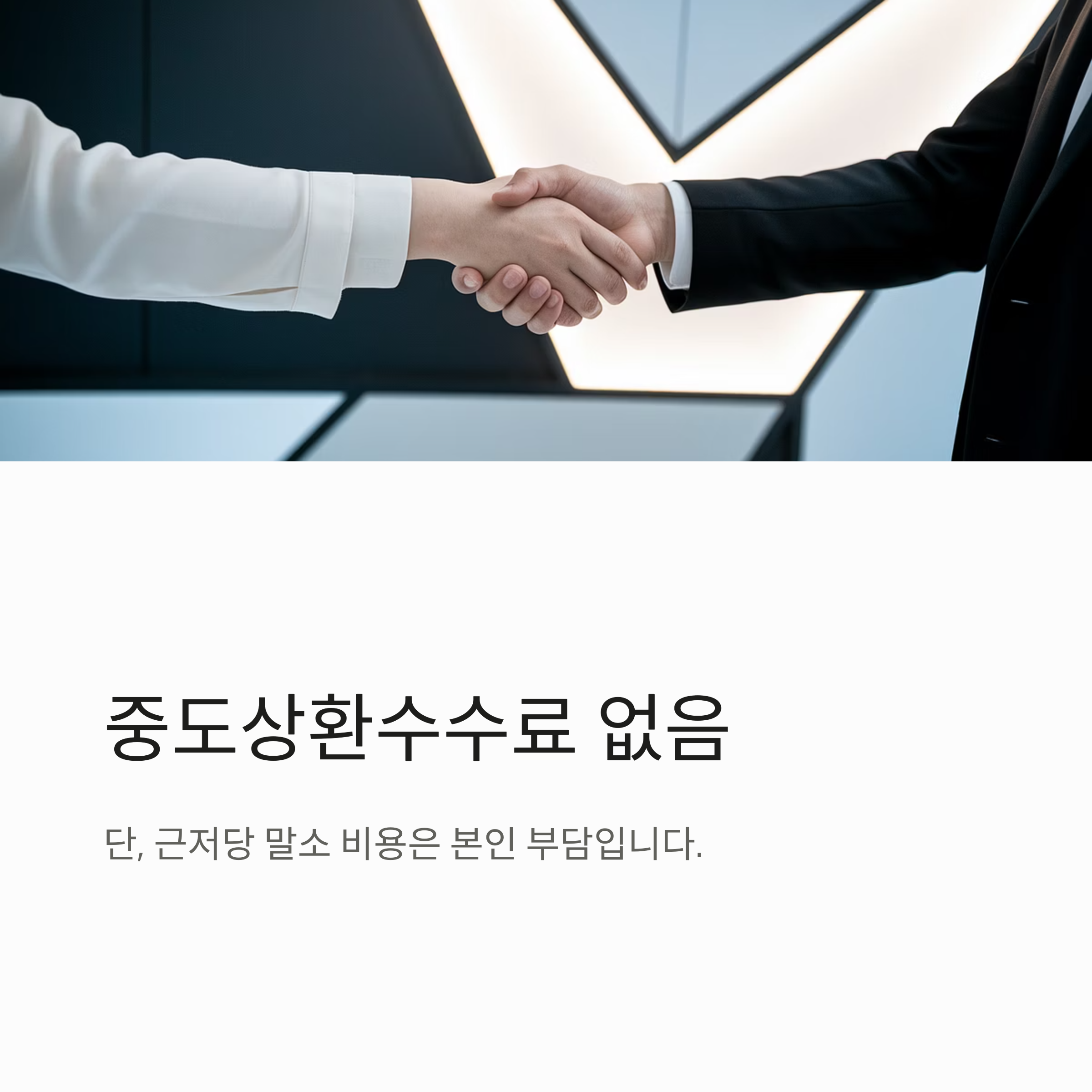 취급수수료, 조기상환수수료 모두 면제이며, 중개 수수료 요구는 불법으로 명시되어 있습니다.