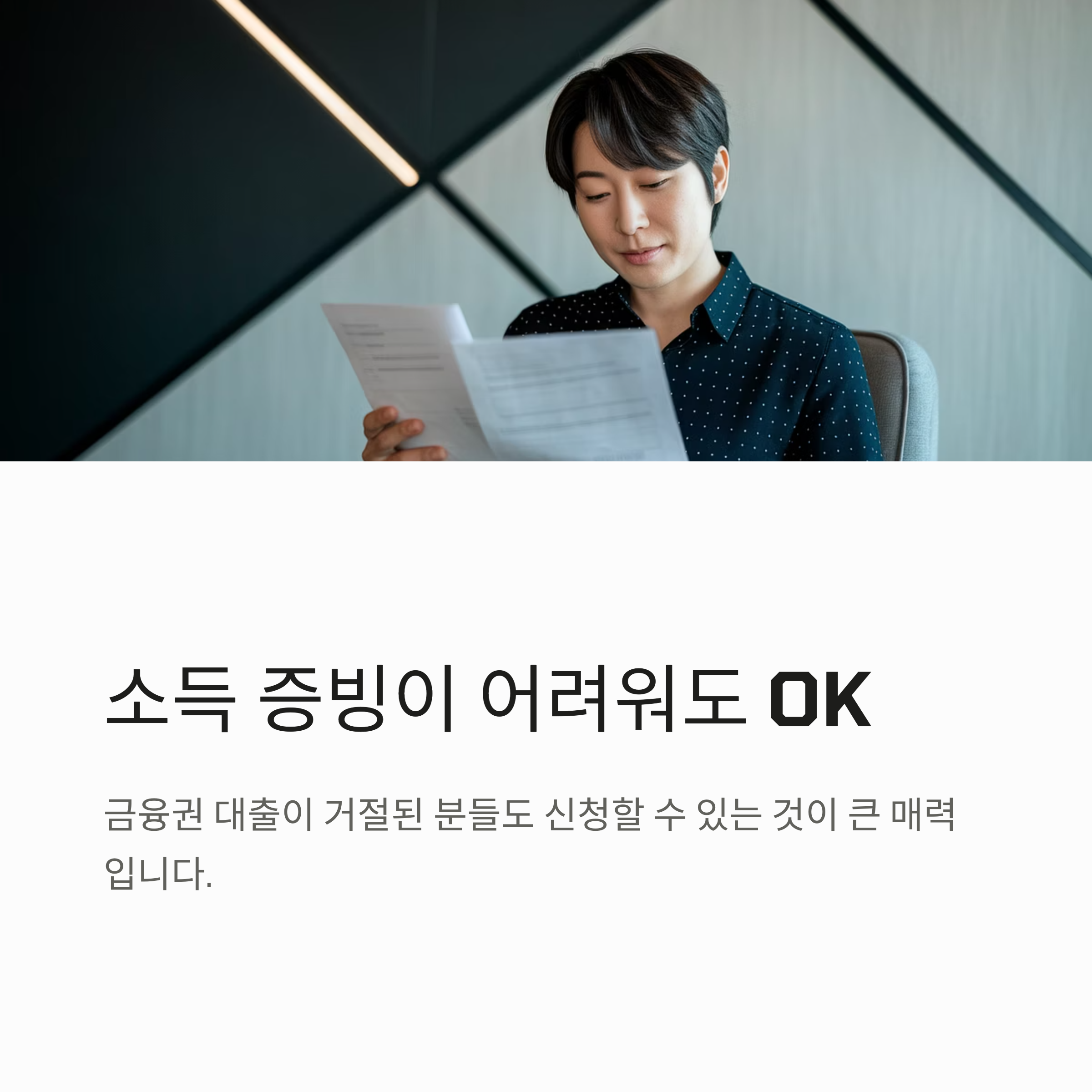 소득 증빙이 어렵거나, 기존에 금융권 대출이 거절된 분들도 신청할 수 있다는 점이 이 상품의 큰 매력입니다.