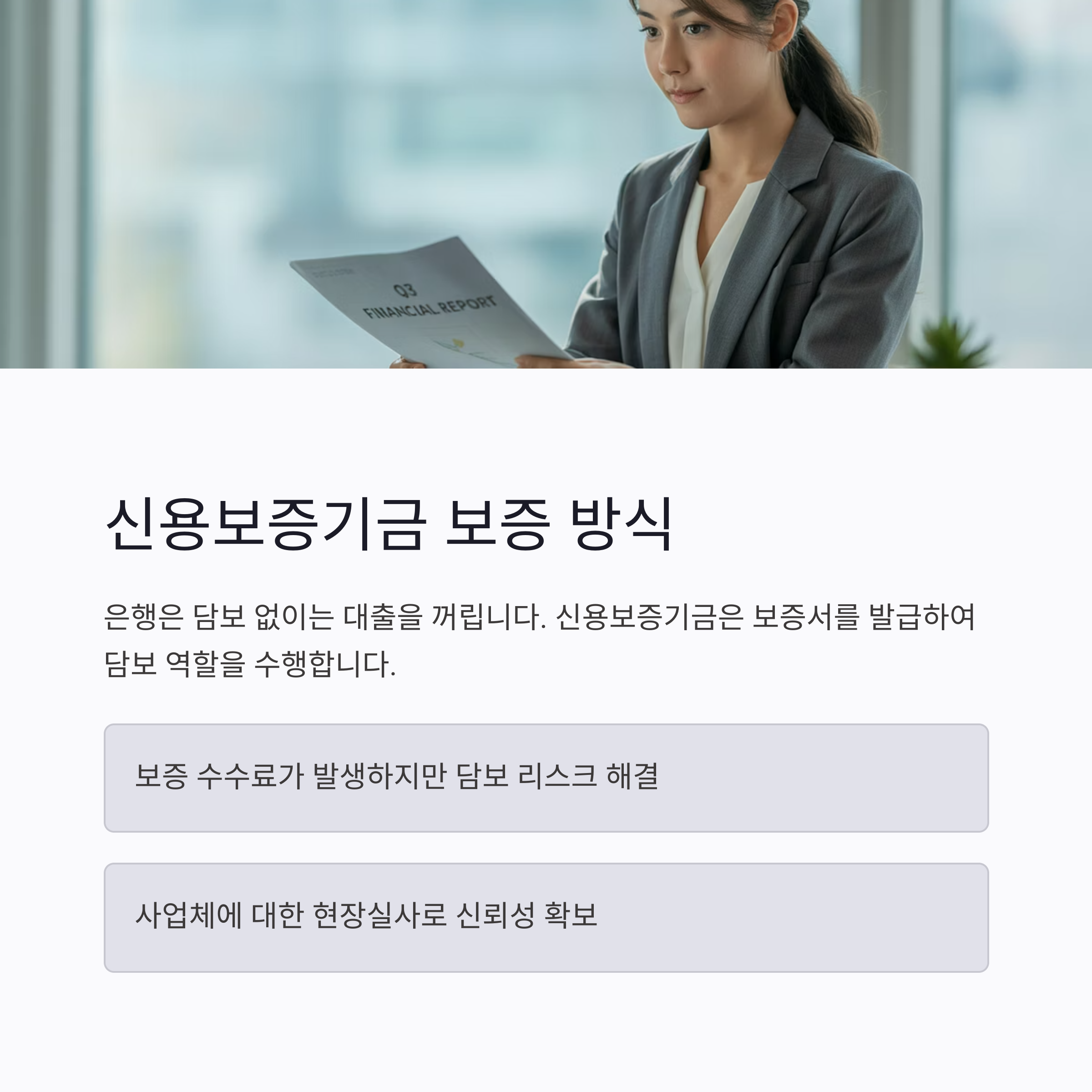 은행 대출 시 요구되는 담보 대신 보증서를 제공하여 대출이 가능하도록 가교 역할을 합니다.