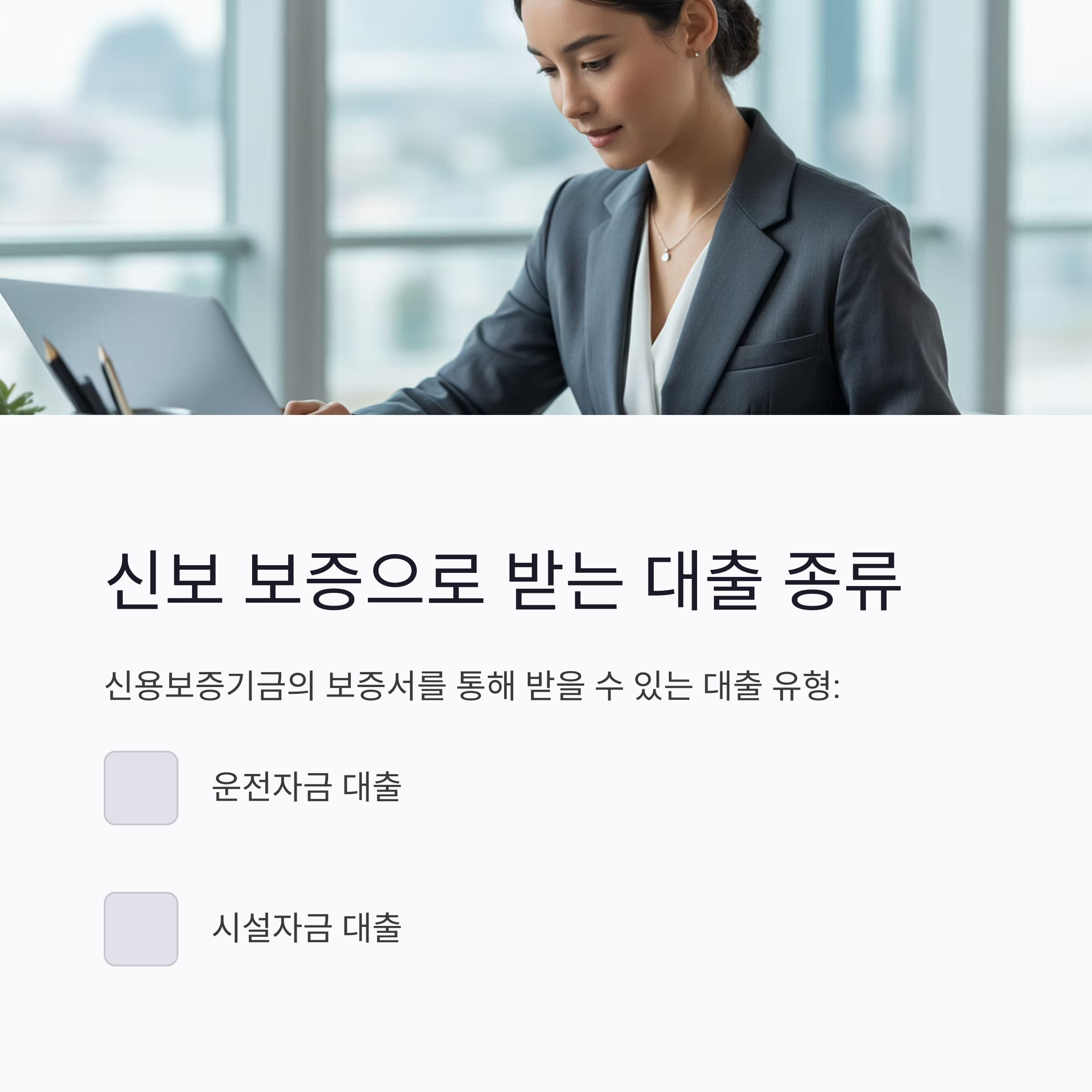 수행합니다.이 보증서를 바탕으로기업은 은행에서 운전자금이나 시설자금 대출을 받을 수 있습니다.