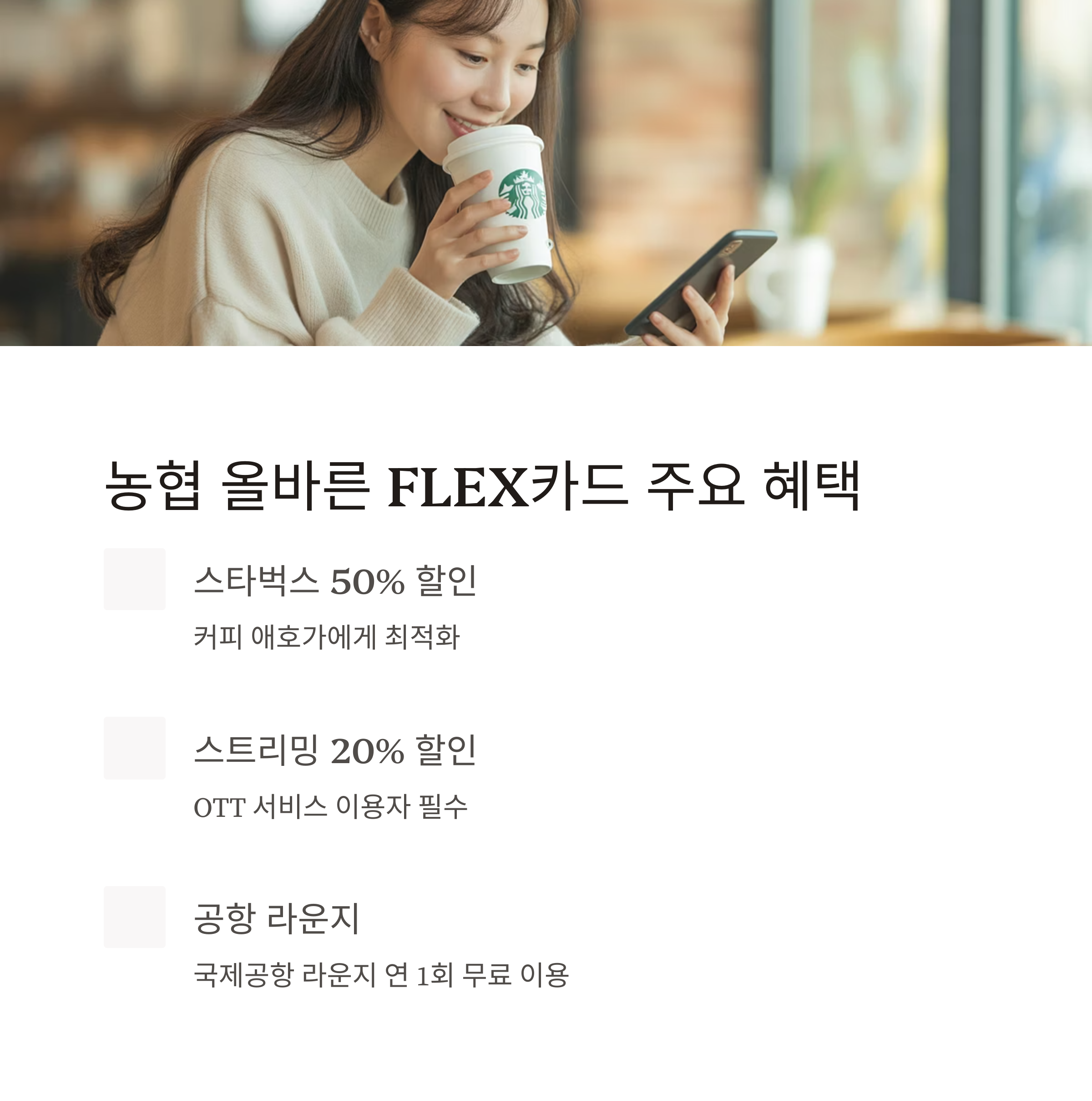 | NH 올바른 FLEX | 32,000원 | 카페 50%, 공항 라운지, 스트리밍 | 10,000원~ |