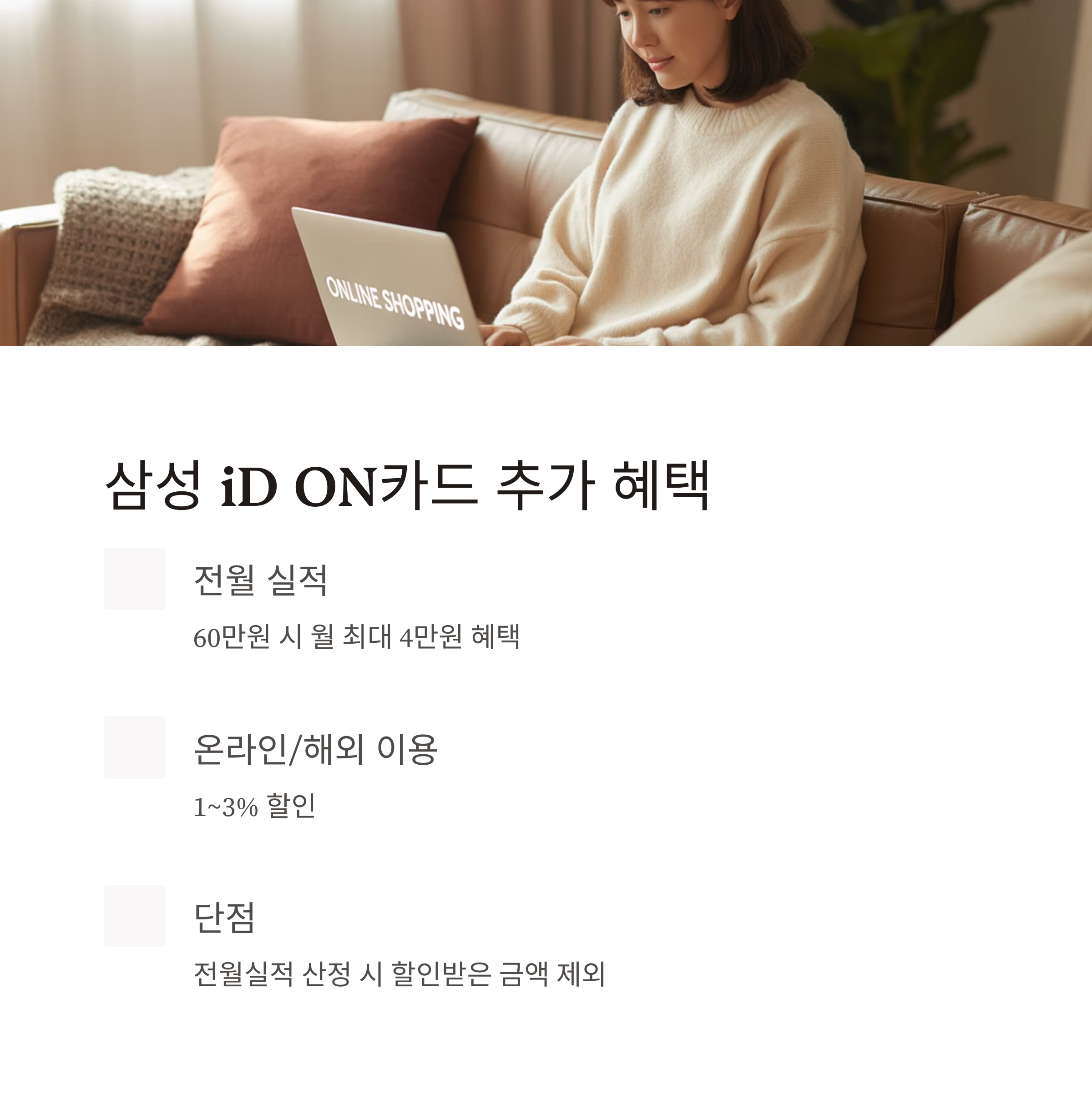 A5. 삼성 iD ON카드는 온라인 간편결제 및 해외 사용 시 최대 3% 할인됩니다.