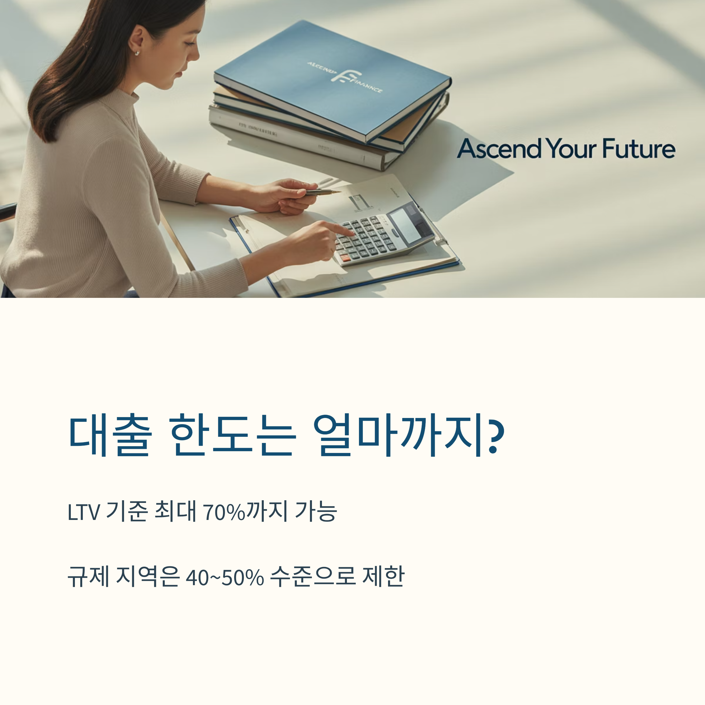 A2. LTV 기준 최대 70%까지 가능하며, 규제 지역은 40~50% 수준으로 제한될 수 있습니다.