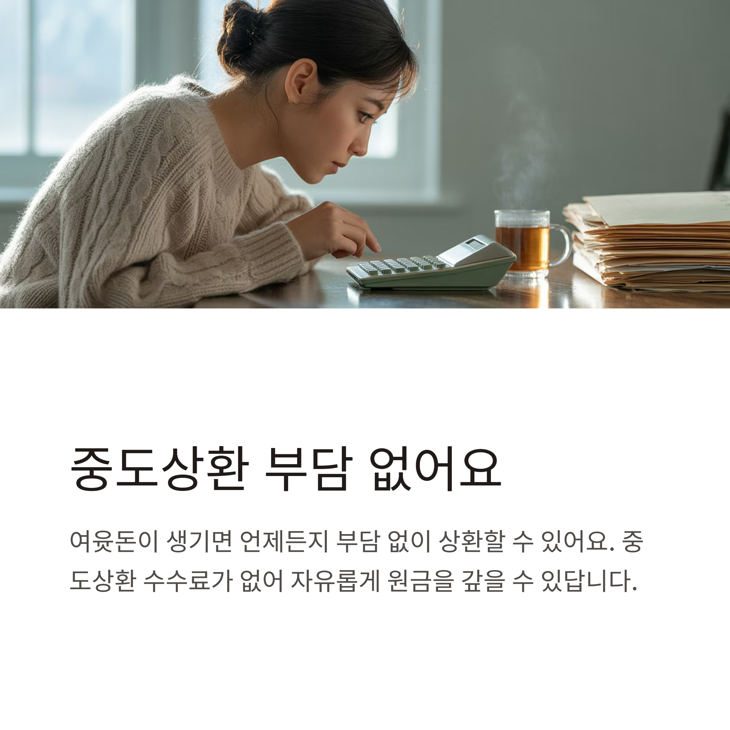 중도상환해도 수수료가 없어, 여윳돈 생기면 언제든 상환해도 부담 없습니다.