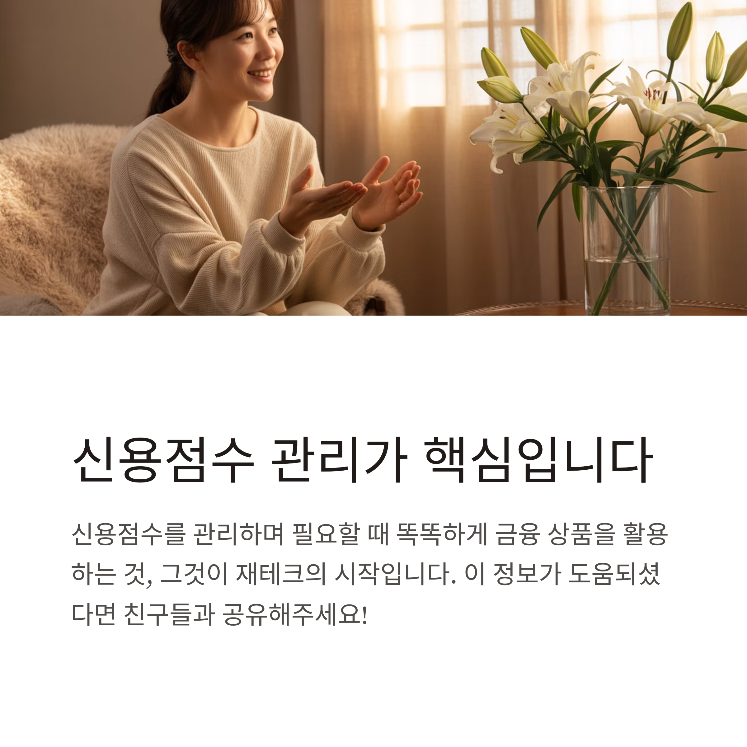 신용점수를 관리하며 필요할 때 똑똑하게 금융 상품을 활용하는 것, 그것이 재테크의 시작입니다.