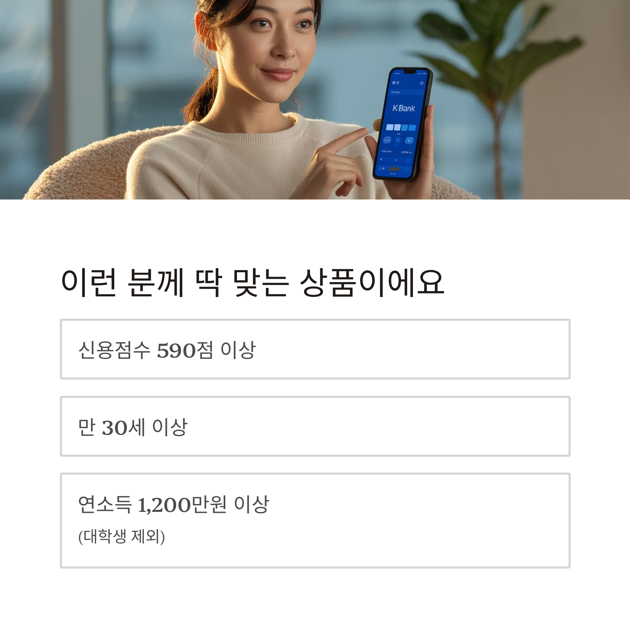 A1. 만 30세 이상, 신용점수 590점 이상, 연소득 1,200만원 이상(대학생 제외)이면 신청 가능합니다.