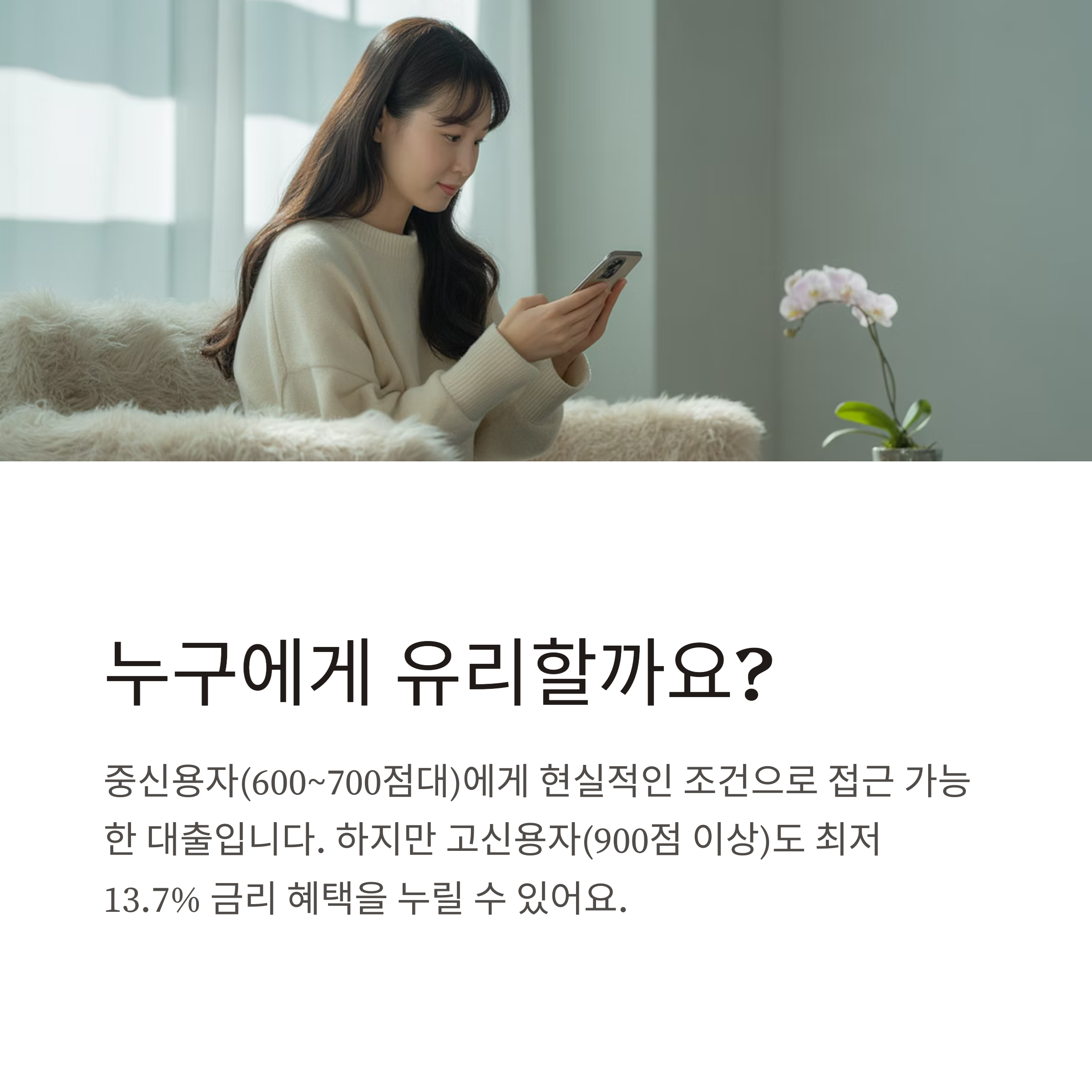 중신용자(600~700점대)에게 현실적인 조건으로 접근 가능한 대출입니다.