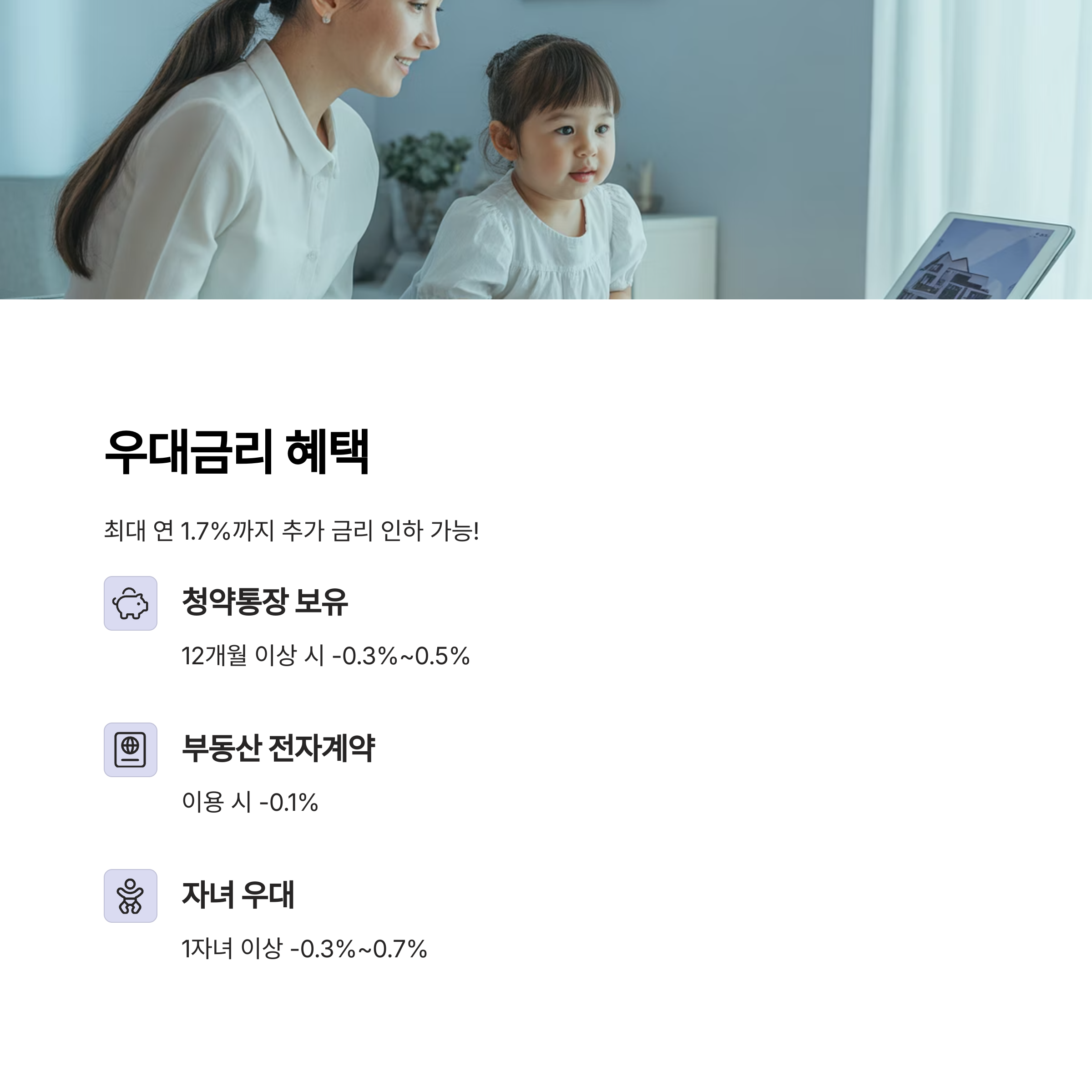 최대 연 1.7%까지 추가 금리 인하가 가능합니다. 아래 항목에 해당하면 우대금리를 받으세요.