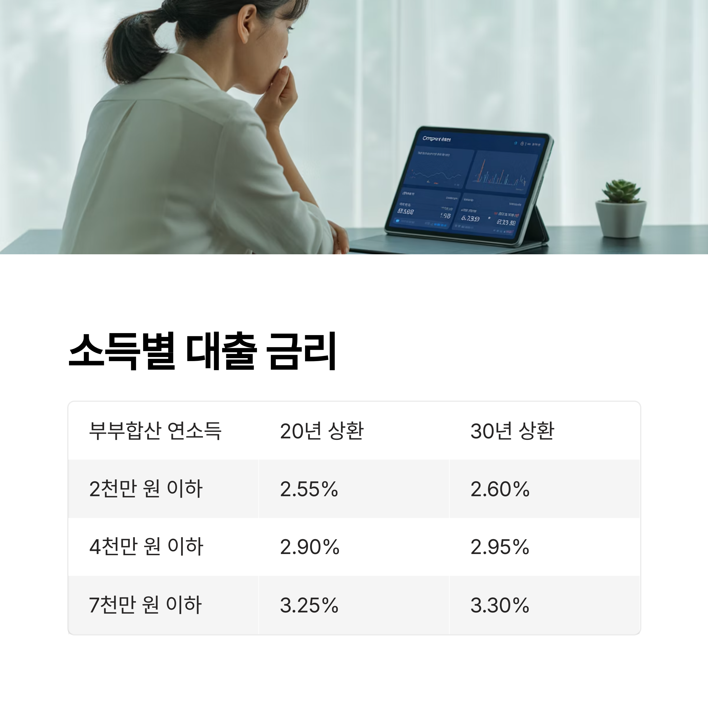 신혼부부 대상 금리는 소득과 상환 기간에 따라 차등 적용됩니다.