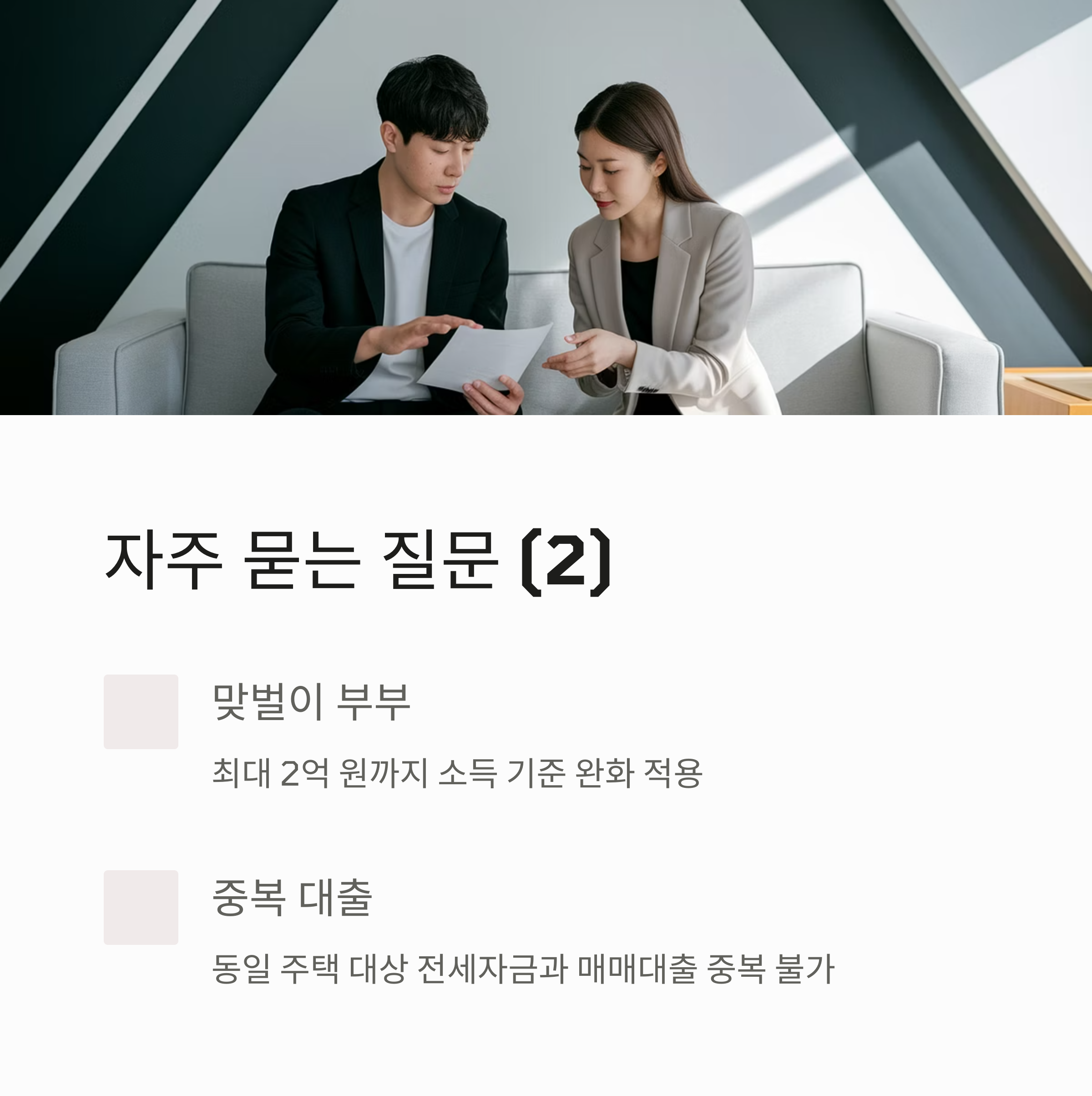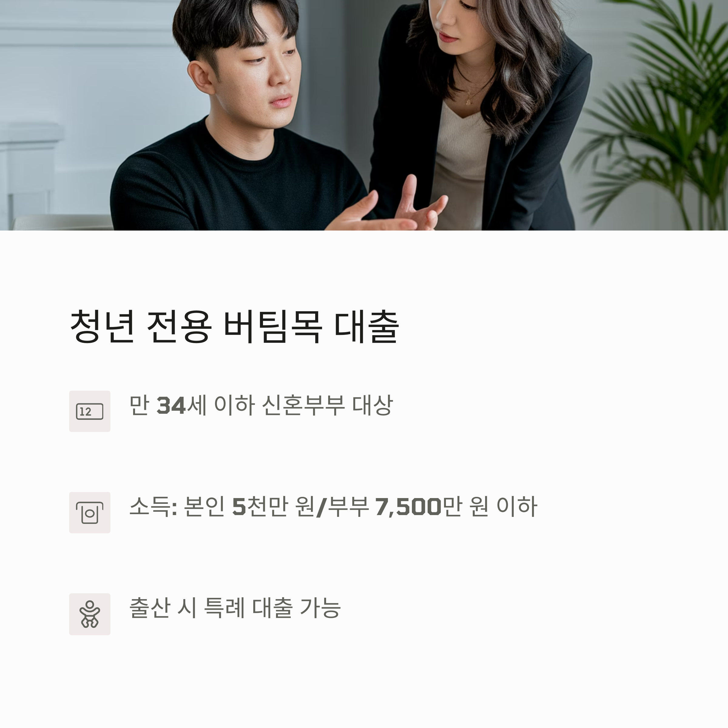 ✔ 소득 요건: 본인 5천만 원 / 부부합산 7,500만 원 이하