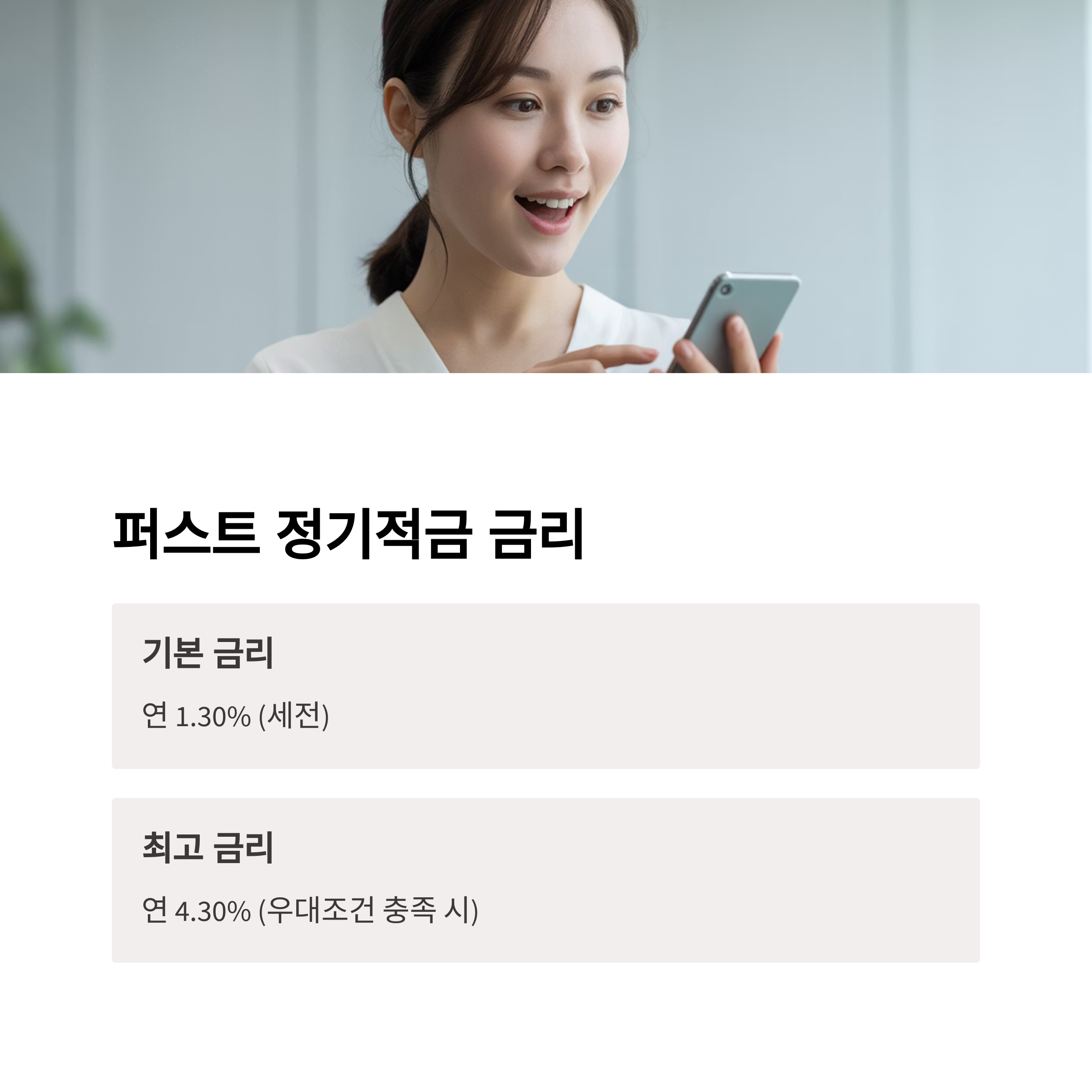 | 퍼스트 정기적금 | 1년간 미거래 고객 | 연 1.30% | 연 4.30% | 월 적립식 | 매달 저축형 |