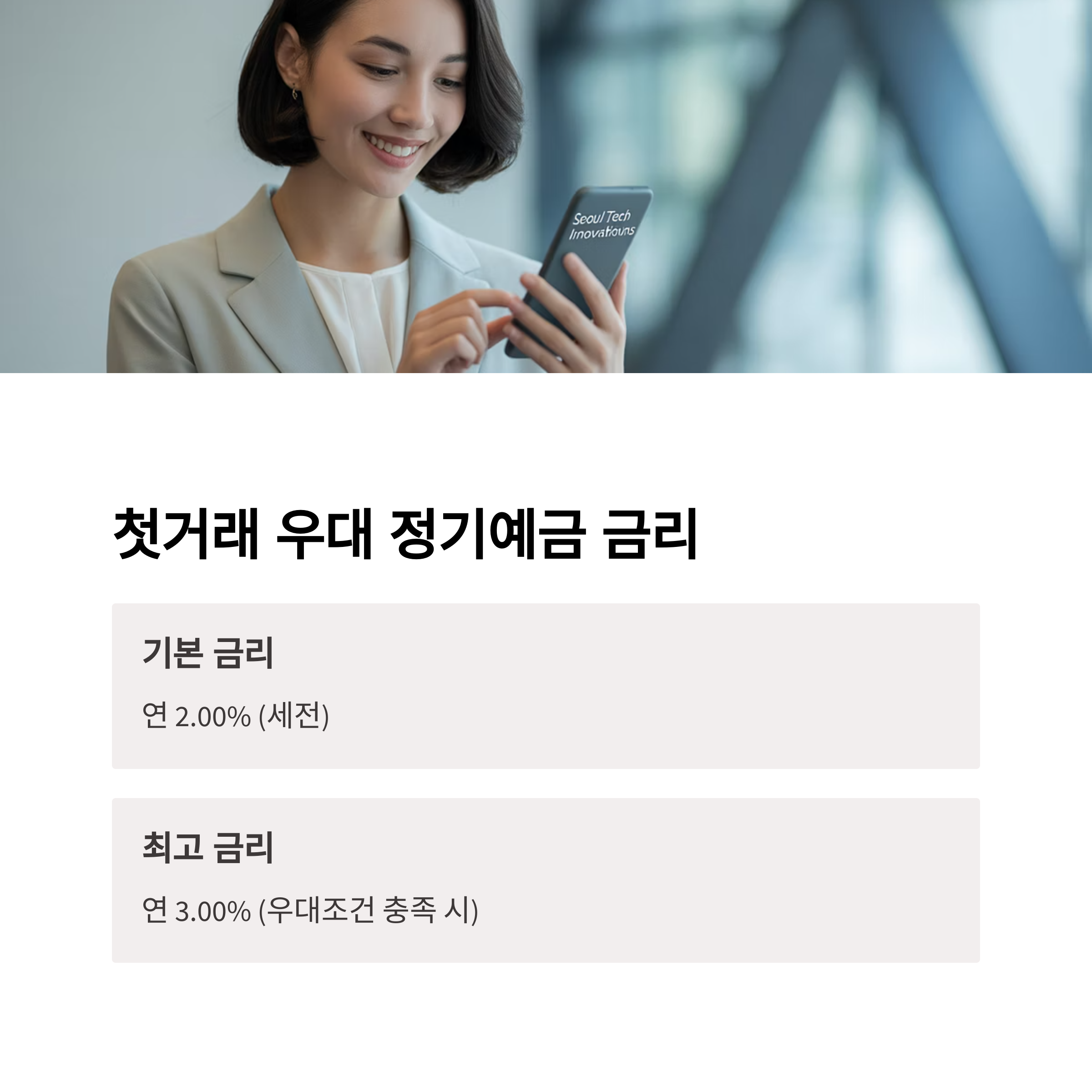 | 첫거래 우대 정기예금 | 신규 고객 | 연 2.00% | 연 3.00% | 목돈 일시예치 | 여유 자금 운용 |