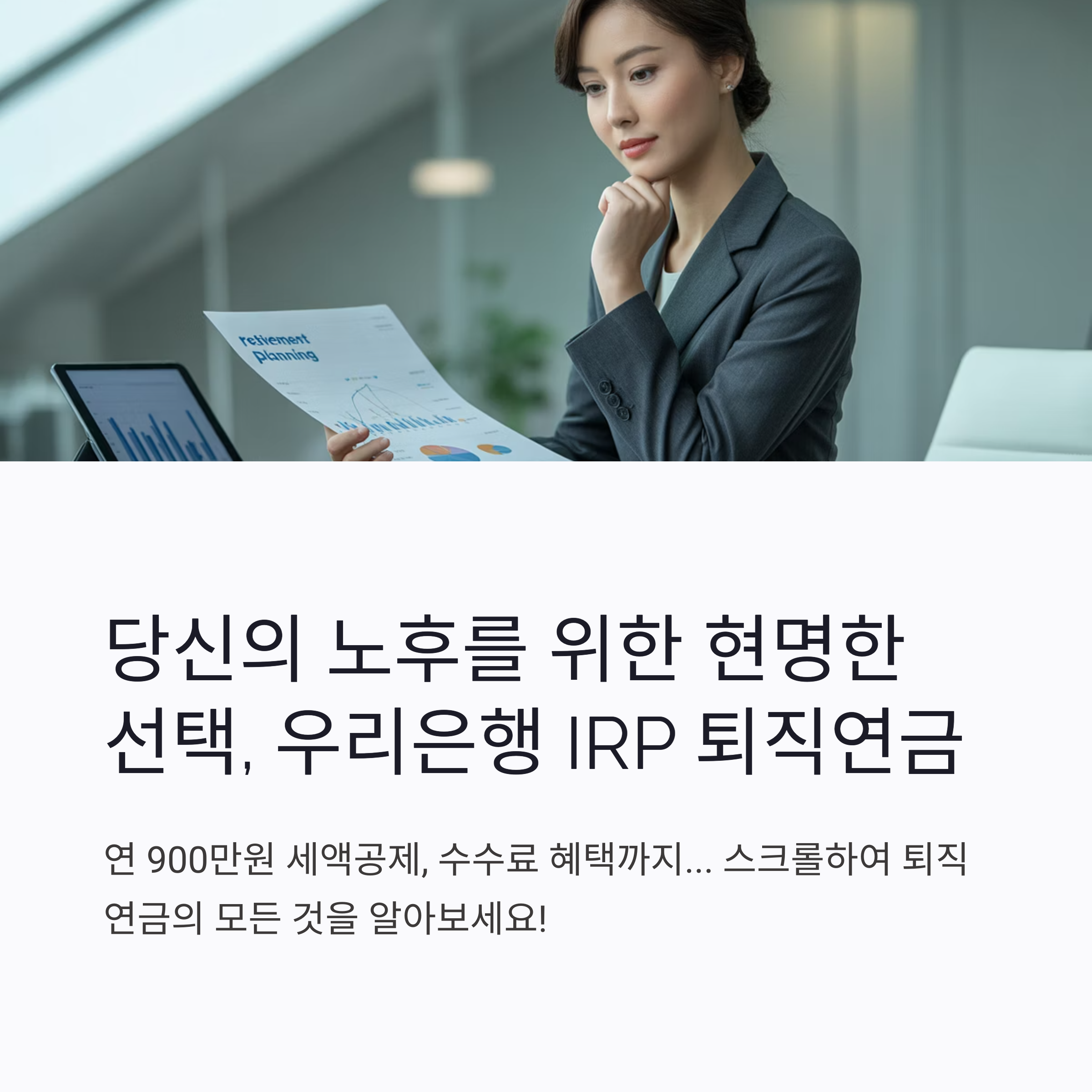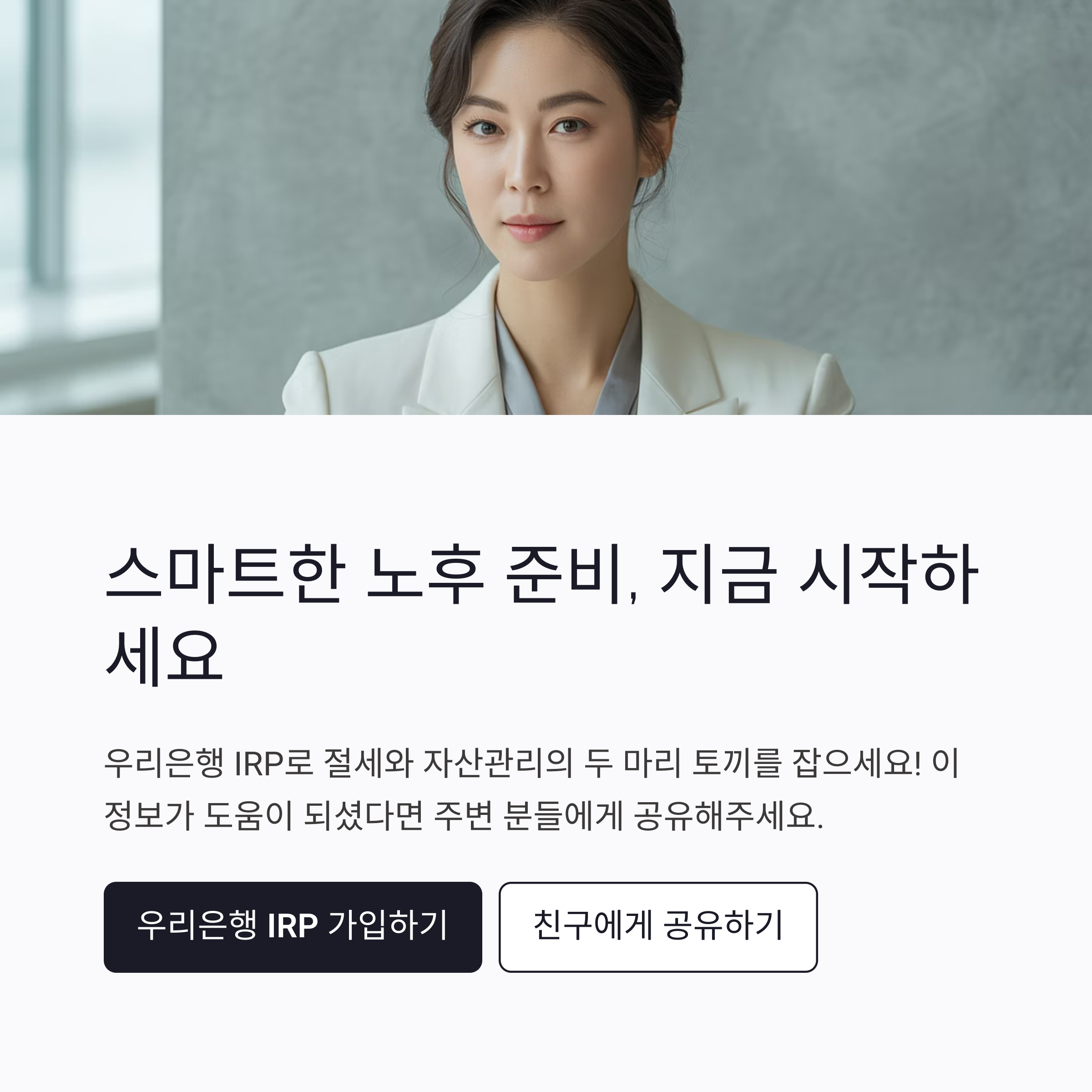 지금 바로 우리은행 IRP에 가입해 스마트한 노후를 준비하세요.