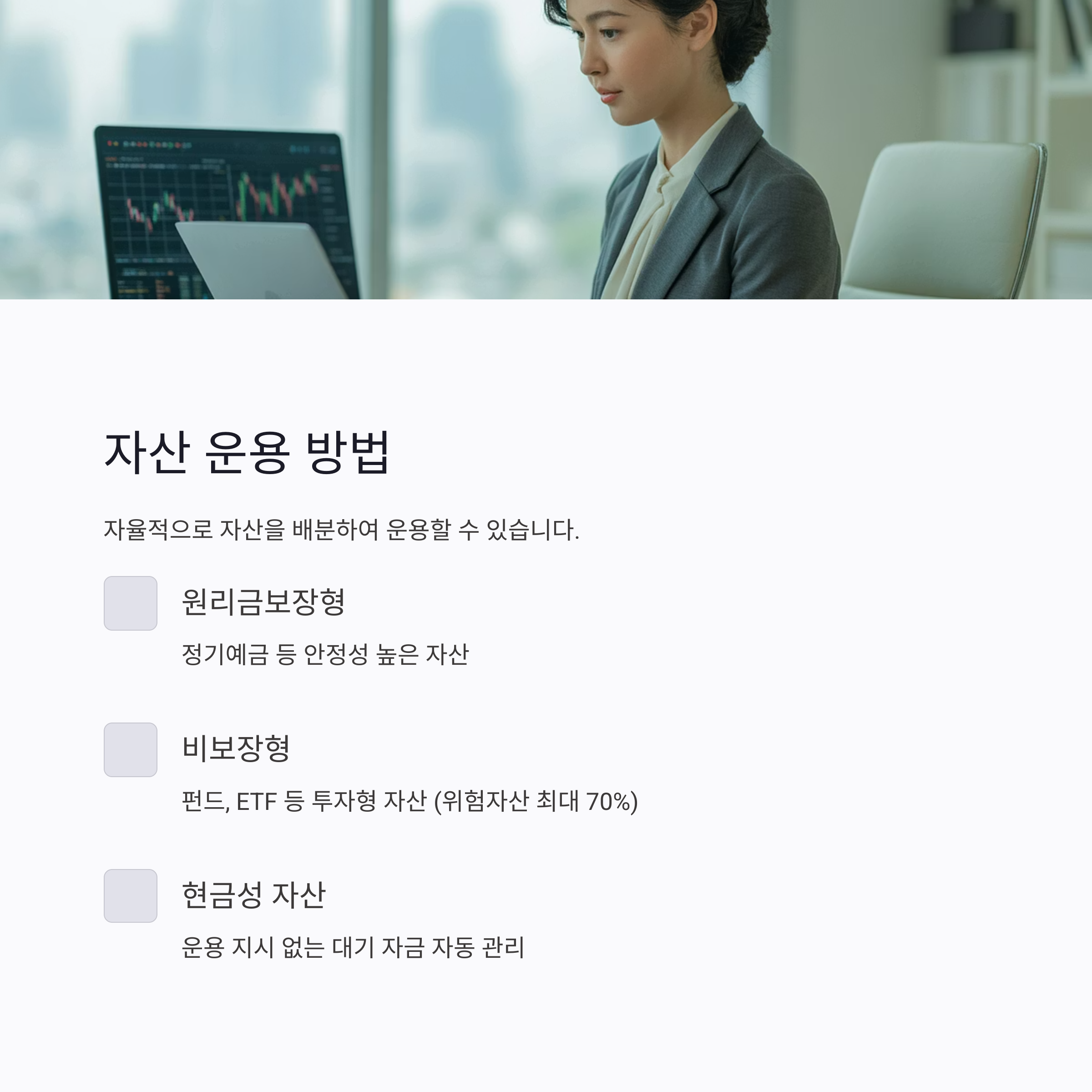 ▶ 비보장형: 펀드, ETF 등 투자형 자산 (위험자산 최대 70%)