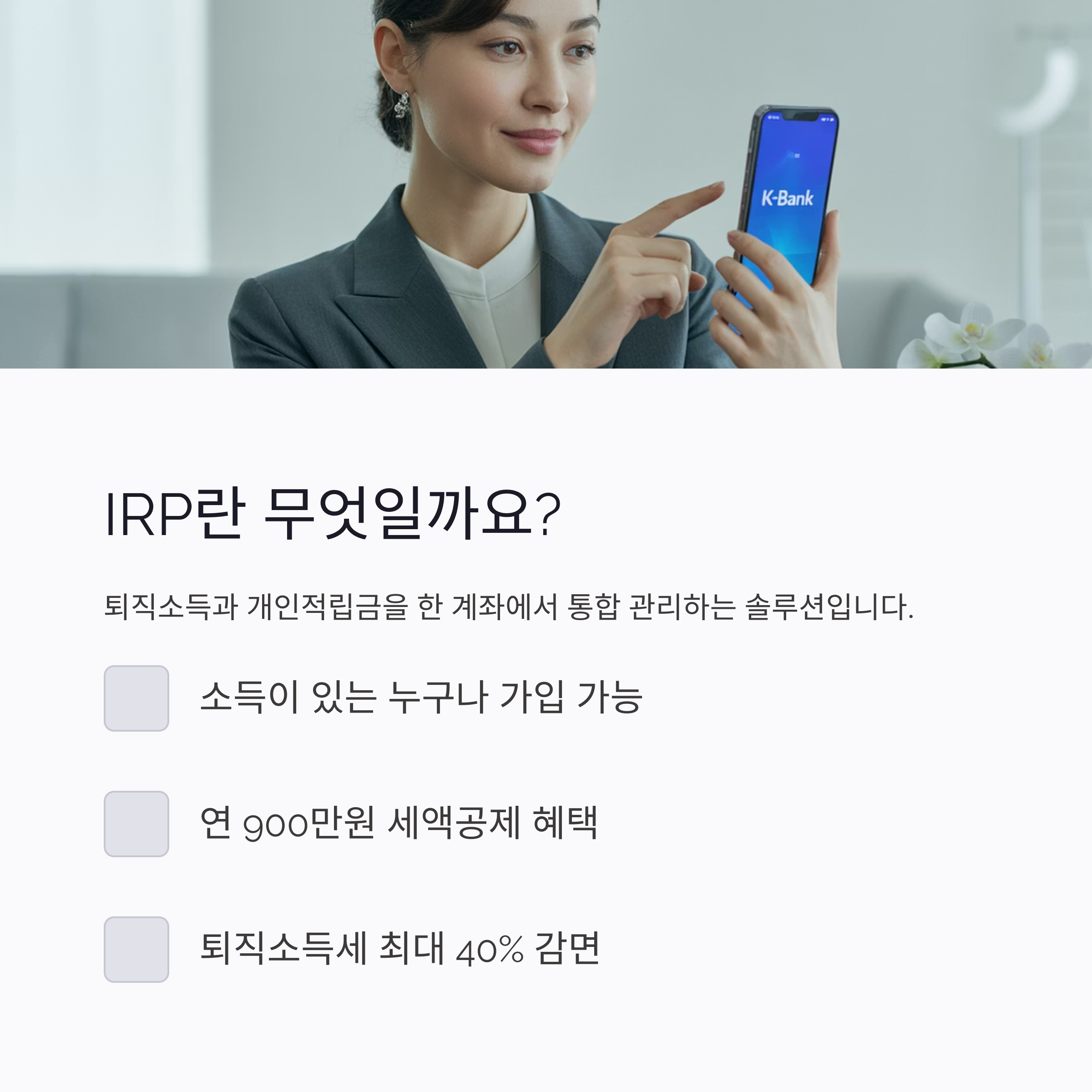 개인형 퇴직연금(IRP) 은 퇴직소득과 개인적립금을 한 계좌에서 운용하며, 소득이 있는 누구나 가입 가능한 제도입니다.